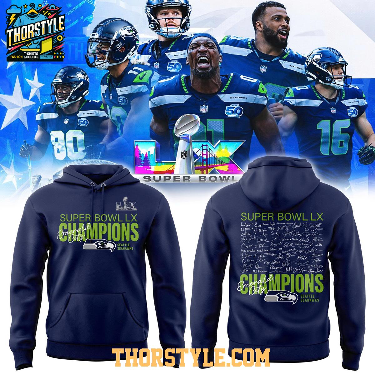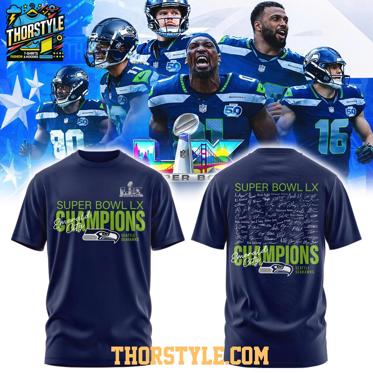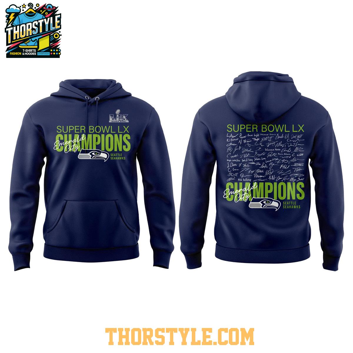 Designed for both style and longevity, this garment is intended to be a cherished memento of a historic season. For optimal care, machine wash cold with like colors and tumble dry on low. Specific care instructions may vary depending on the materials used, so please refer to the garment's label. With proper care, this 2026 Seattle Seahawks Super Bowl Champions LX Signed Hoodie T-Shirt will remain a treasured keepsake, allowing you to relive the glory of a legendary season for years to come.