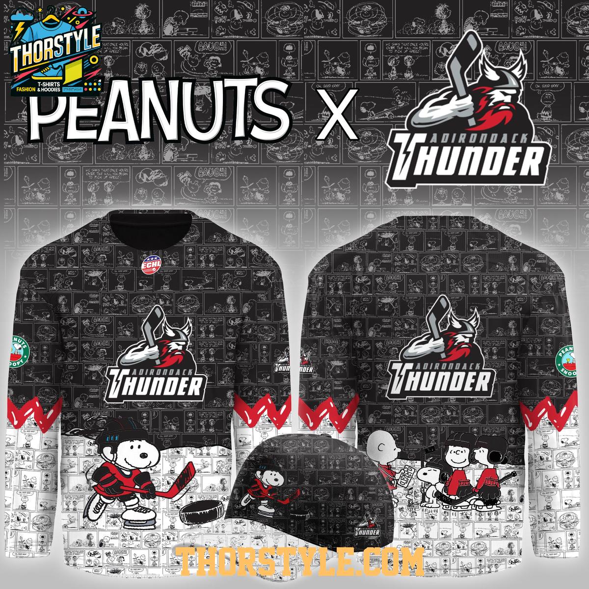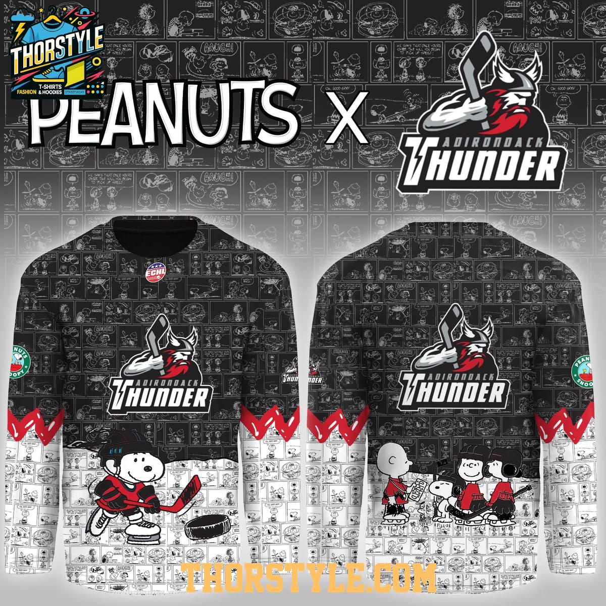 The design features iconic Peanuts comic strips subtly integrated into the jersey's fabric. You'll spot Snoopy in full hockey gear, ready to hit the ice, alongside other beloved characters. The Adirondack Thunder logo is prominently displayed, showcasing your support for the team. This visually striking jersey is sure to turn heads whether you're at the rink or out and about.