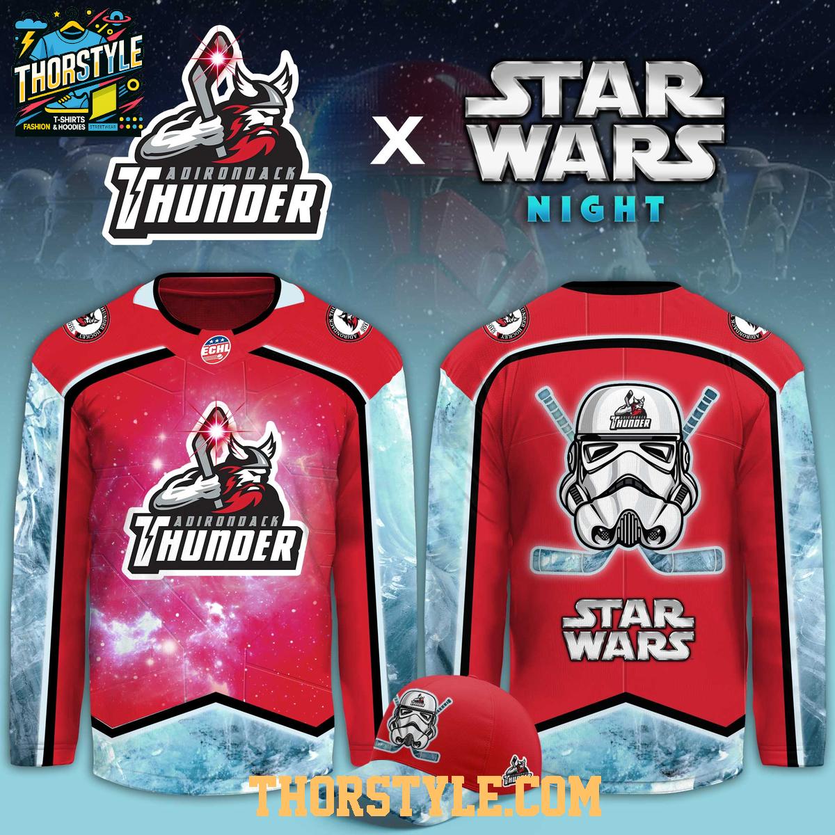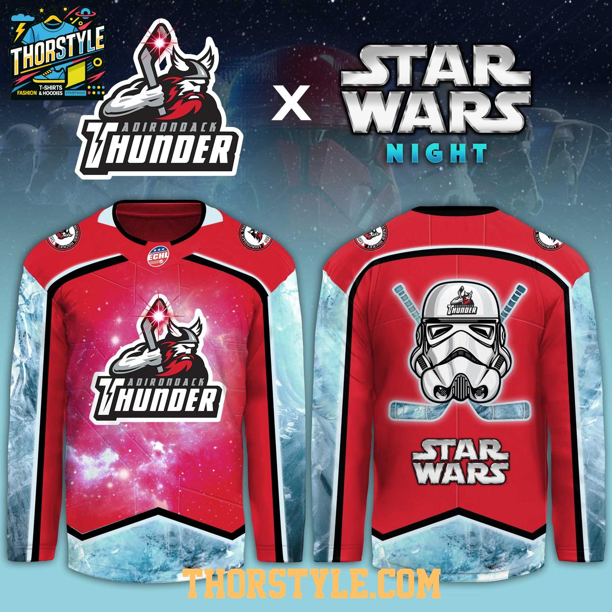 This hockey jersey prominently features the Adirondack Thunder logo, cleverly intertwined with Stormtrooper elements. The design incorporates the team's colors with the distinctive helmet of a Stormtrooper, creating a visually striking and memorable look. The "Star Wars Night" theme is evident throughout the jersey, making it a perfect collectible for fans of both the team and the franchise. The jersey includes the ECHL logo, which is a testament to its authenticity.