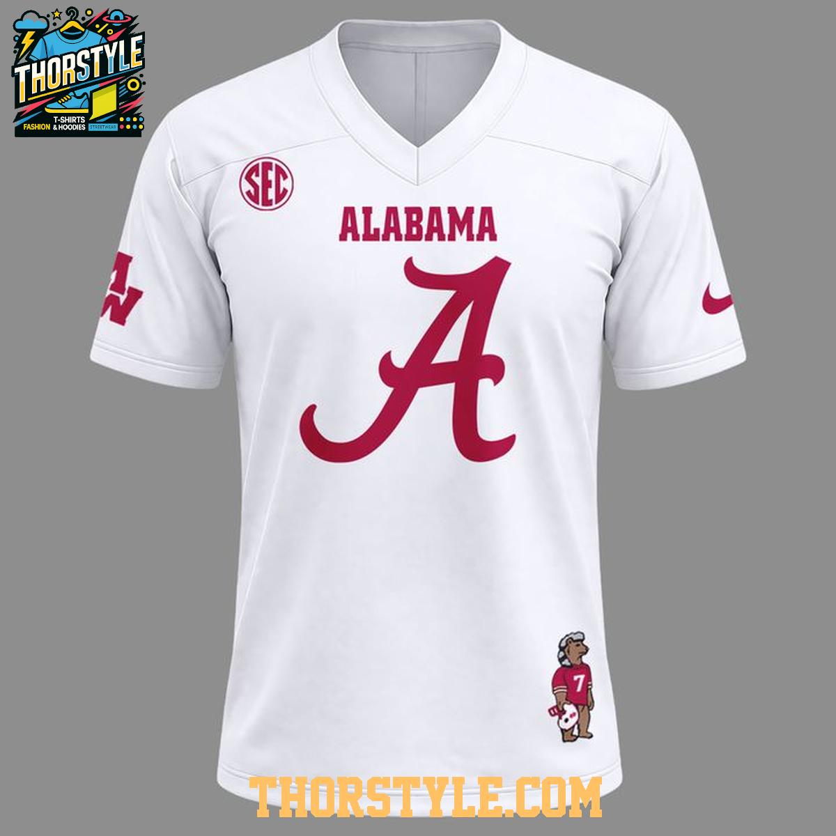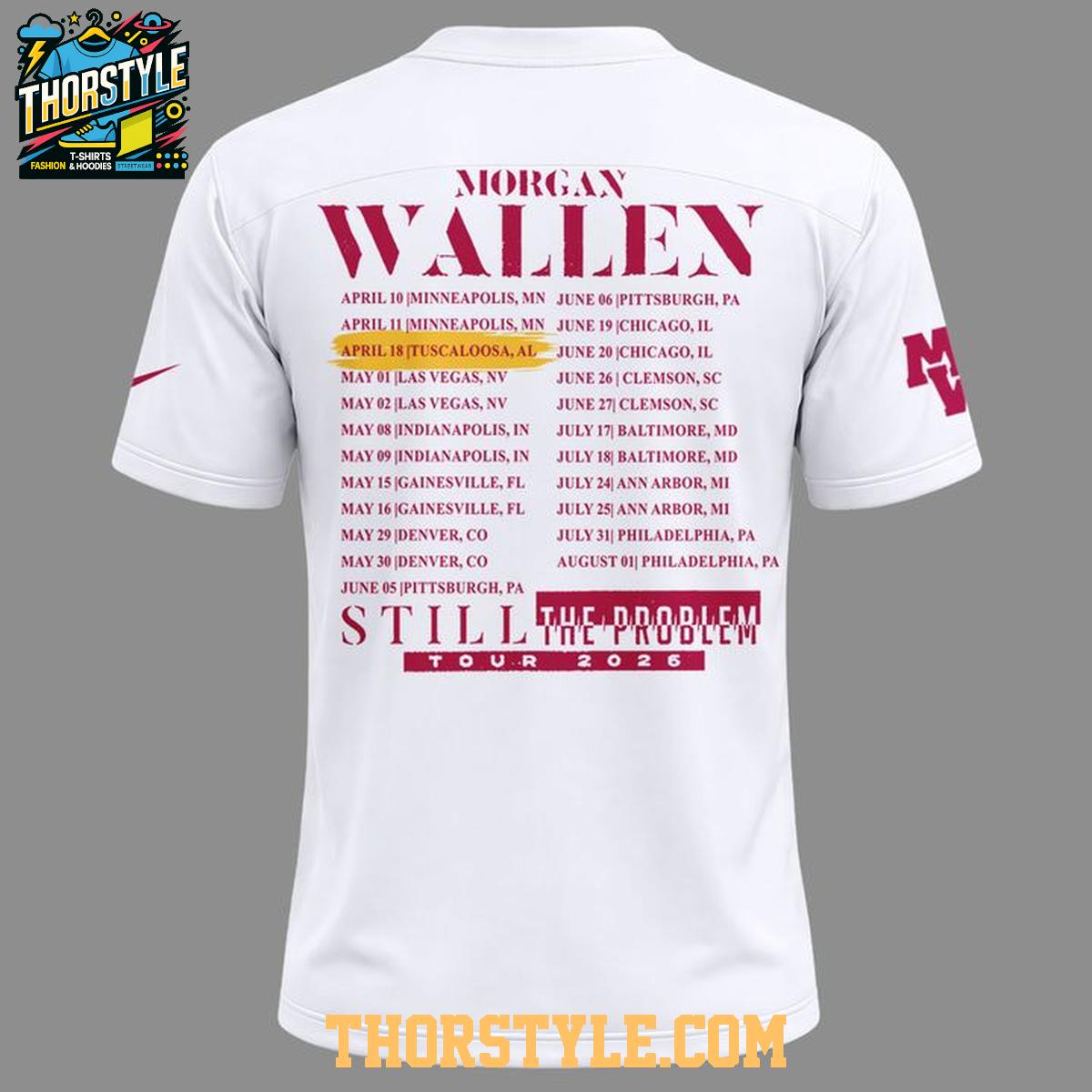 This white football jersey prominently features "Alabama" across the chest, accompanied by the iconic "A" logo in crimson. The design incorporates the Morgan Wallen "Still The Problem" 2026 tour schedule on the back, listing tour dates and locations. Subtle design elements complete the look, blending athletic aesthetics with music memorabilia.