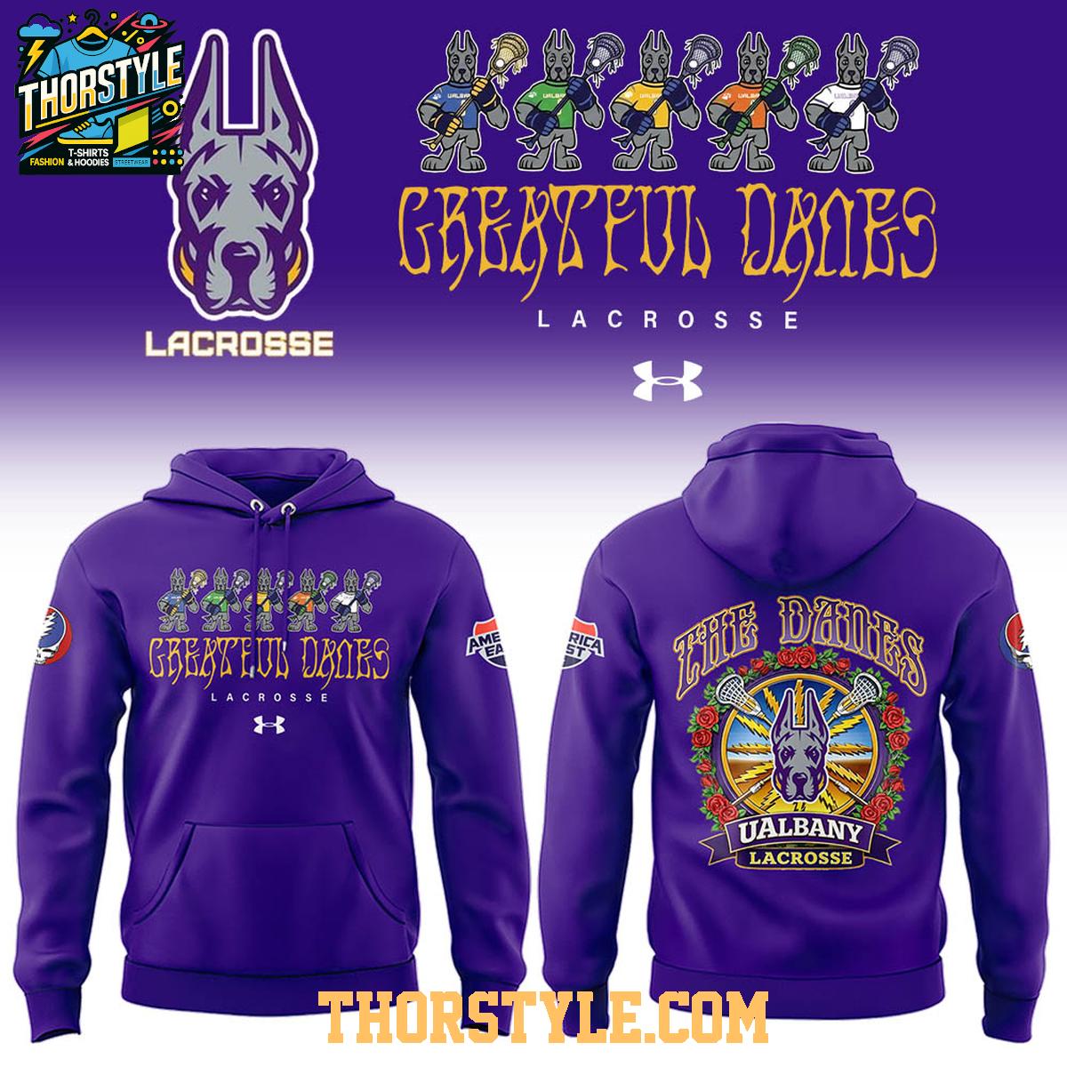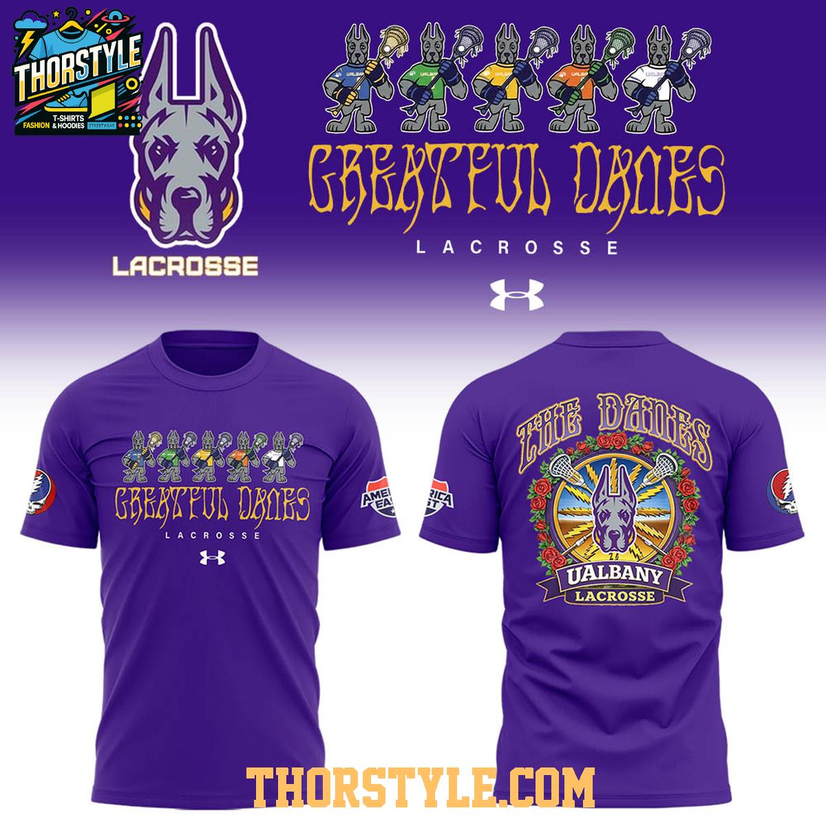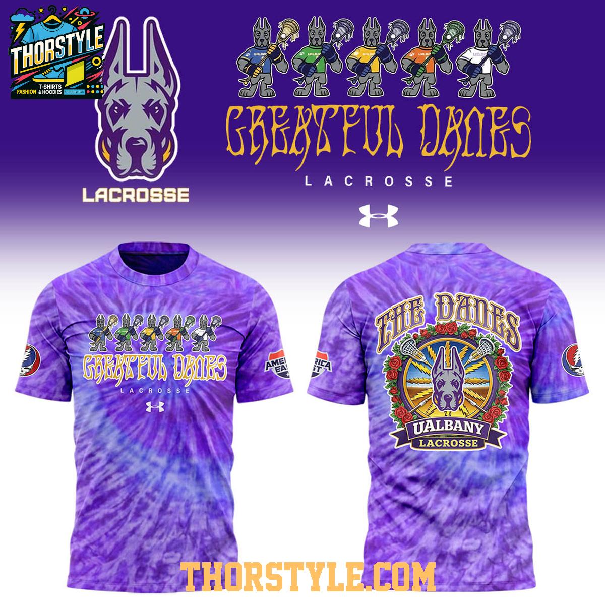 This eye-catching hoodie t-shirt features a vibrant design with a purple tie-dye pattern. The front prominently displays "Greatful Danes Lacrosse" alongside playful Great Dane characters wielding lacrosse sticks. Turn around, and you'll find "The Danes UAlbany Lacrosse" encircled by roses, paying homage to the team and the city. The blend of sports and music makes this shirt a true conversation starter.