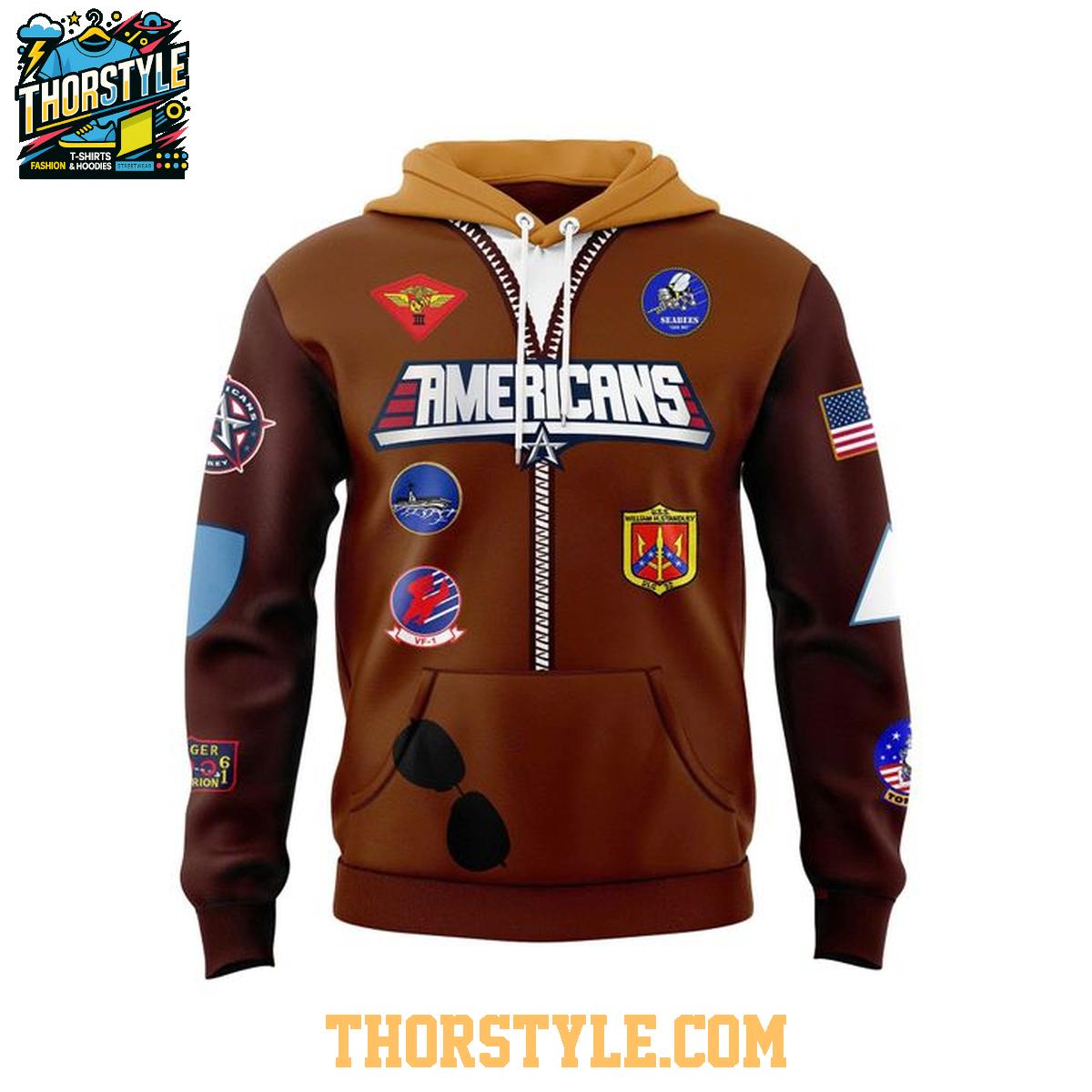 This hoodie t-shirt hybrid features a distinctive design inspired by classic flight jackets. The front showcases the "AMERICANS" team name prominently, alongside various patches and emblems reminiscent of naval aviation. The back displays the Allen Americans logo, further solidifying your allegiance. The design incorporates elements that pay homage to the U.S. Navy Mavericks, creating a bold and patriotic look.