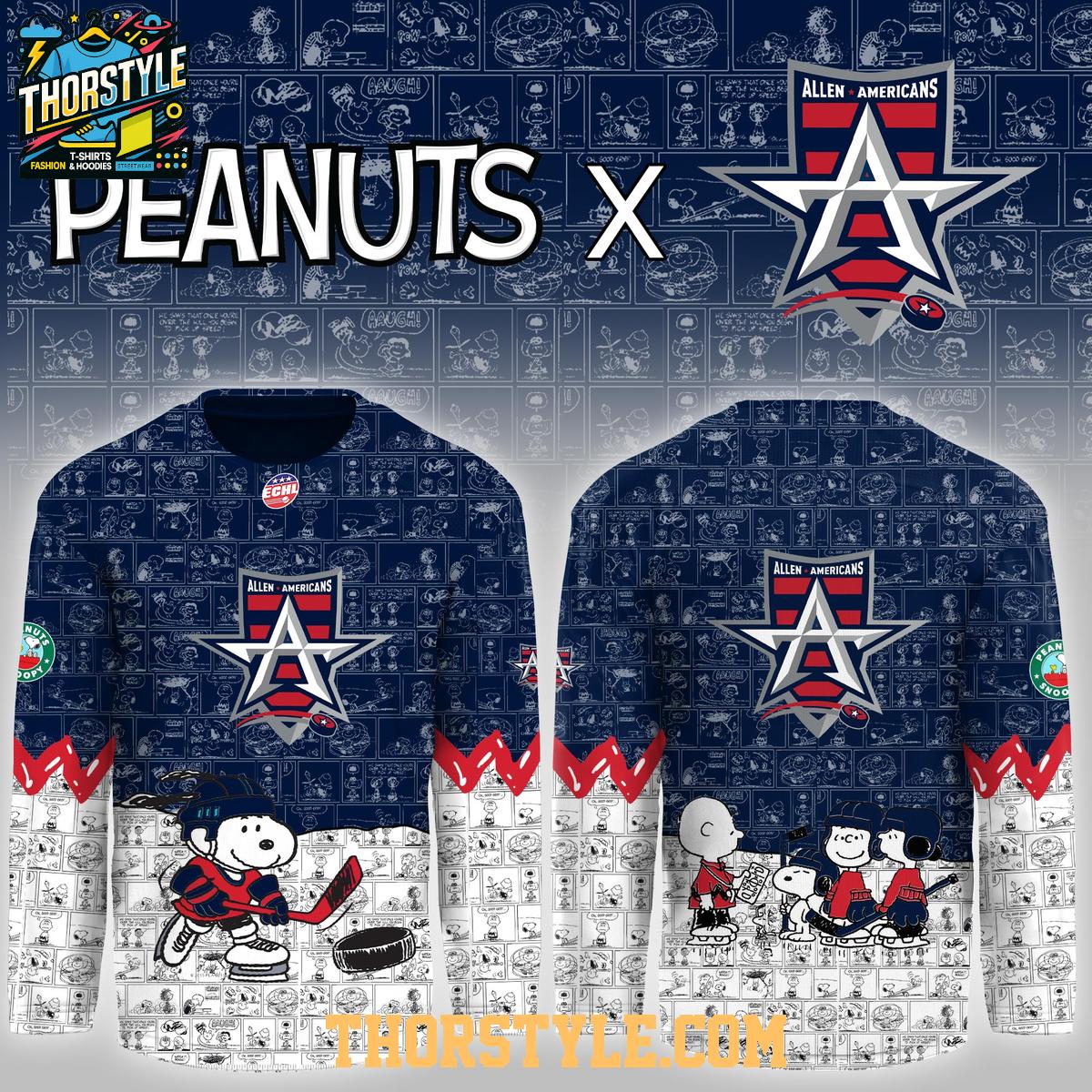 The design features iconic Peanuts characters integrated seamlessly with the Allen Americans team logo and colors. You'll find Snoopy, Charlie Brown, and the whole gang engaging in hockey-themed antics, set against a backdrop of classic comic strip panels. The jersey's construction includes reinforced stitching in key areas, ensuring it can withstand the rigors of game day or everyday wear.