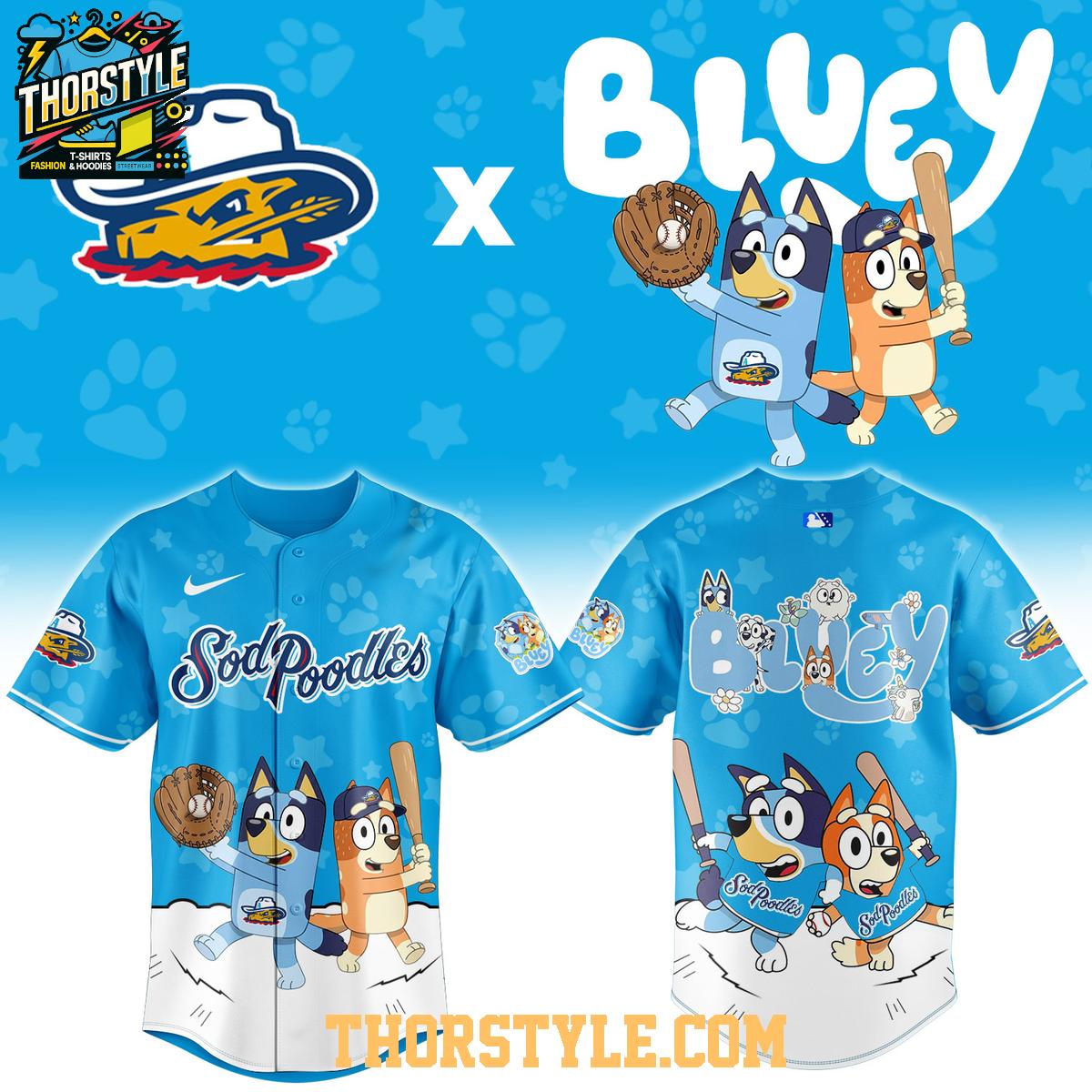 This eye-catching baseball jersey features a vibrant design that blends the iconic Sod Poodles logo with playful Bluey-themed graphics. The front showcases Bluey and Bingo in baseball attire, ready to play ball, while the back proudly displays "Bluey" alongside more characters from the show. The jersey's light blue colorway provides a refreshing and cheerful look, perfect for sunny days at the ballpark or casual outings.
