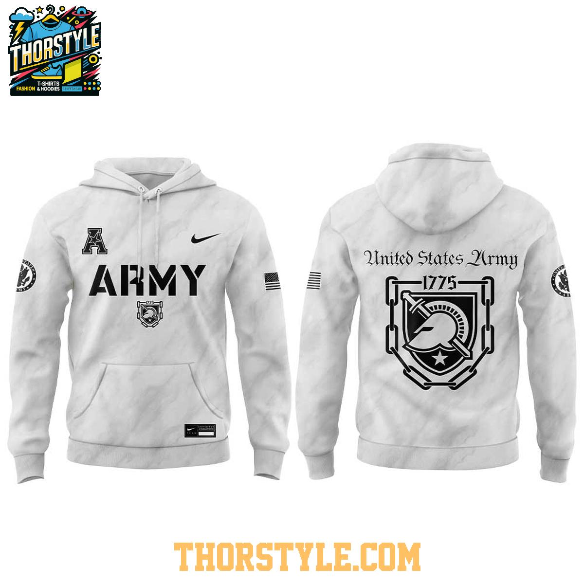 Expertly designed, the crisp white pullover hoodie features the iconic "A ARMY" emblem and a Nike swoosh on the front, symbolizing quality and collegiate pride. The sleeves showcase a patriotic American flag and a distinctive circular Army logo, reflecting deep-rooted traditions.