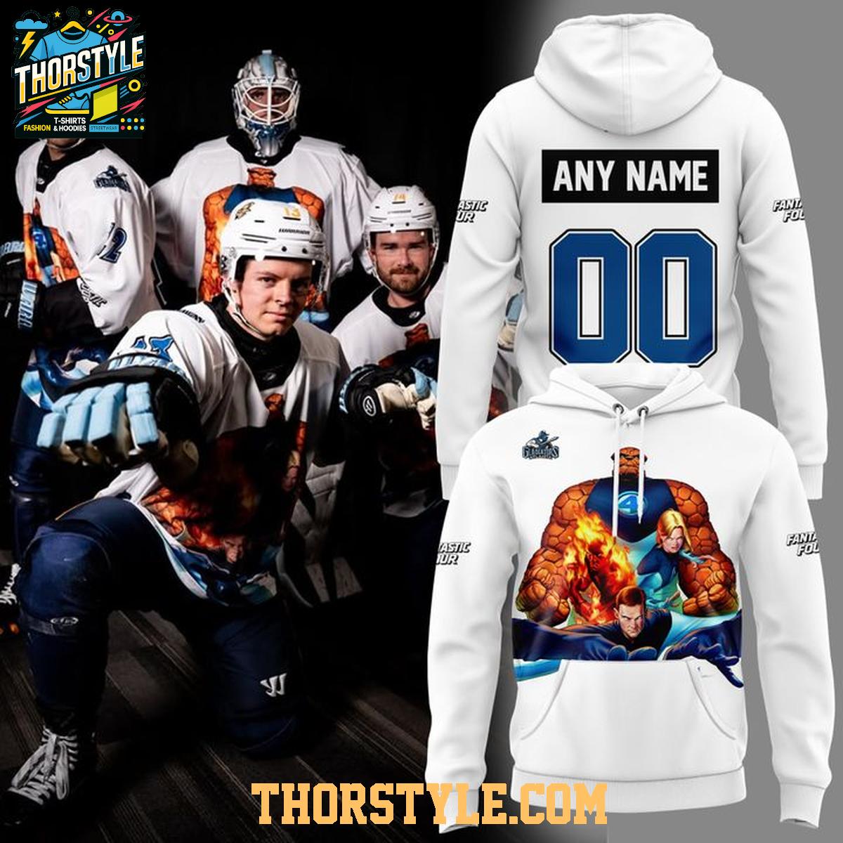 Show your team spirit and superhero fandom with the Atlanta Gladiators Fantastic Four Marvel Super Heroes 2025 Personalized Hoodie. This unique hoodie merges the excitement of Gladiators hockey with the iconic imagery of Marvel's First Family, creating a standout piece for any fan's wardrobe. Personalize it with your name and favorite number to make it truly your own.
