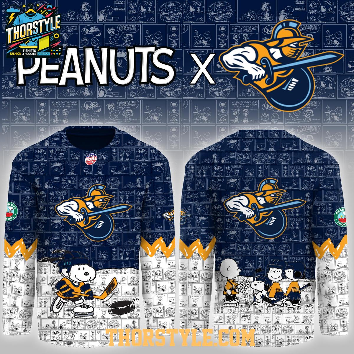 This officially licensed hockey jersey features a vibrant design showcasing Snoopy in full hockey gear, alongside classic Peanuts characters. The Gladiators team logo is prominently displayed, interwoven with Peanuts comic strip panels. The combination creates a visually striking and nostalgic piece that’s sure to turn heads whether you're at the arena or just out and about. The jersey is primarily navy blue with white and gold accents.