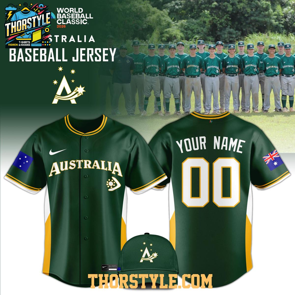 The jersey proudly displays Australia's emblematic green and gold colors, instantly recognizable and deeply symbolic. The team's official logo is prominently featured, reinforcing the jersey's authenticity and connection to the national team. Crafted from lightweight and breathable fabric, this jersey ensures optimal comfort, even during intense games or in warm weather conditions. The classic button-down design and short sleeves provide a traditional baseball aesthetic, appealing to both players and fans alike. Personalize the back with your own name and number to create a truly unique and individualized piece of fan apparel that reflects your personal connection to the team.