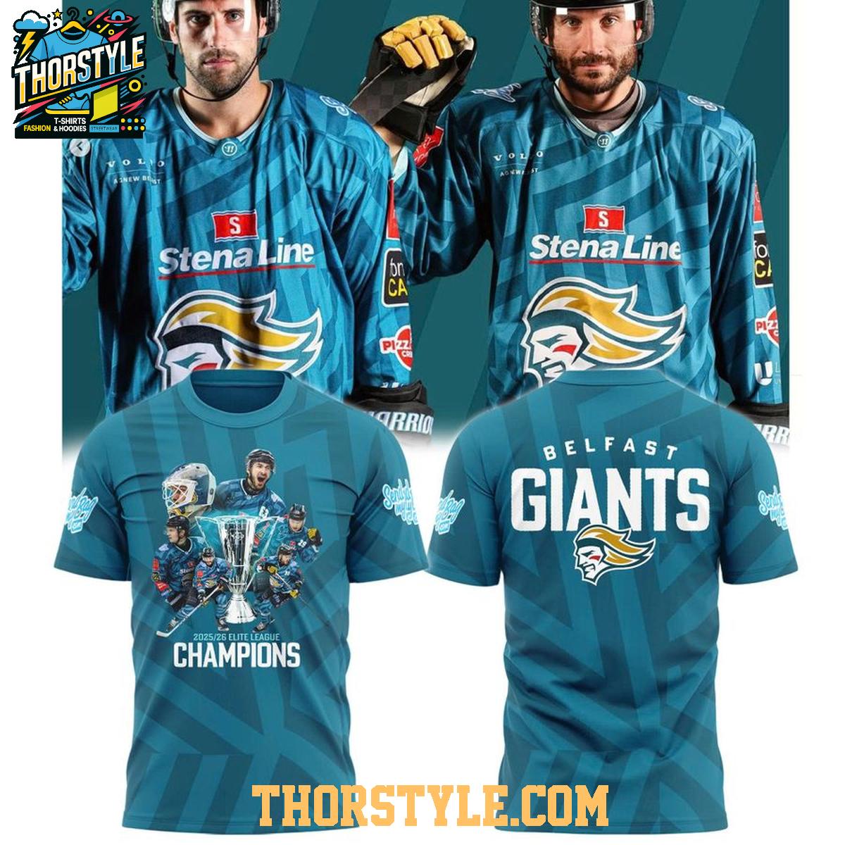 Celebrate the Belfast Giants' triumphant 2026 Elite League Championship victory with the "Belfast Giants Elite League Champions 2026 We Are The Champions Hoodie T-Shirt". This unique garment blends the comfort of a t-shirt with the style of a hoodie, allowing you to showcase your team pride in a distinctive way. It's the perfect apparel for any dedicated Giants fan wanting to commemorate this historic win.