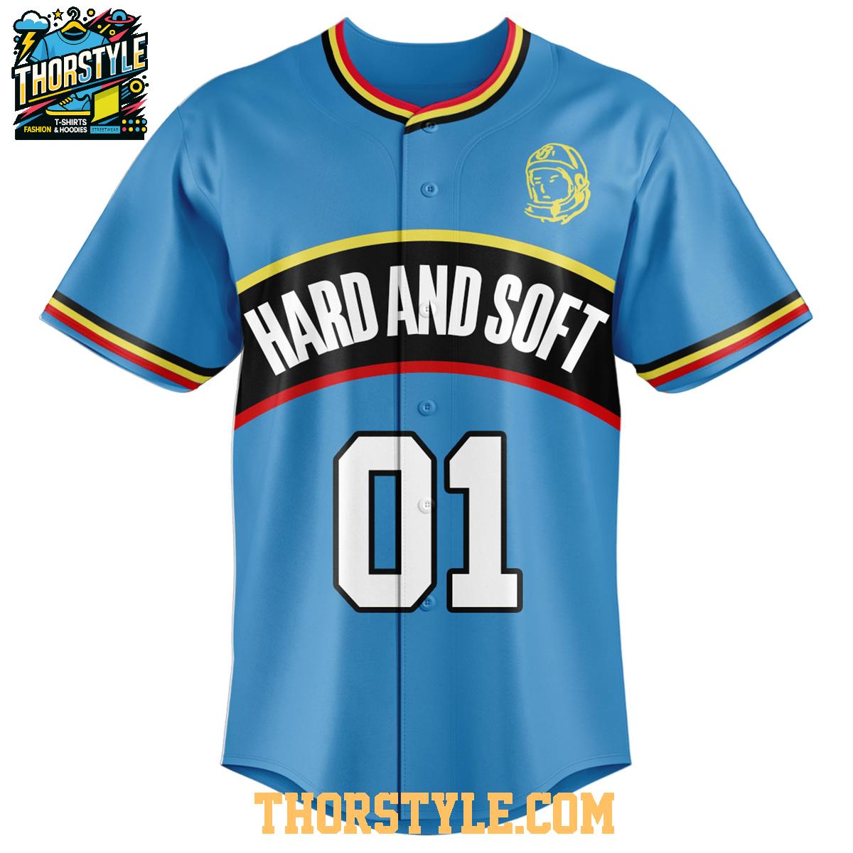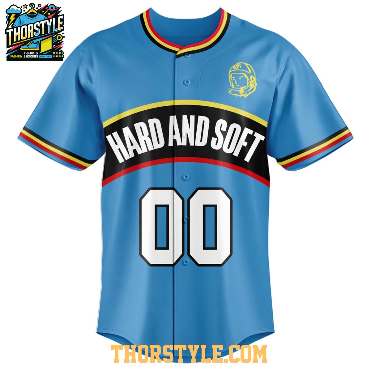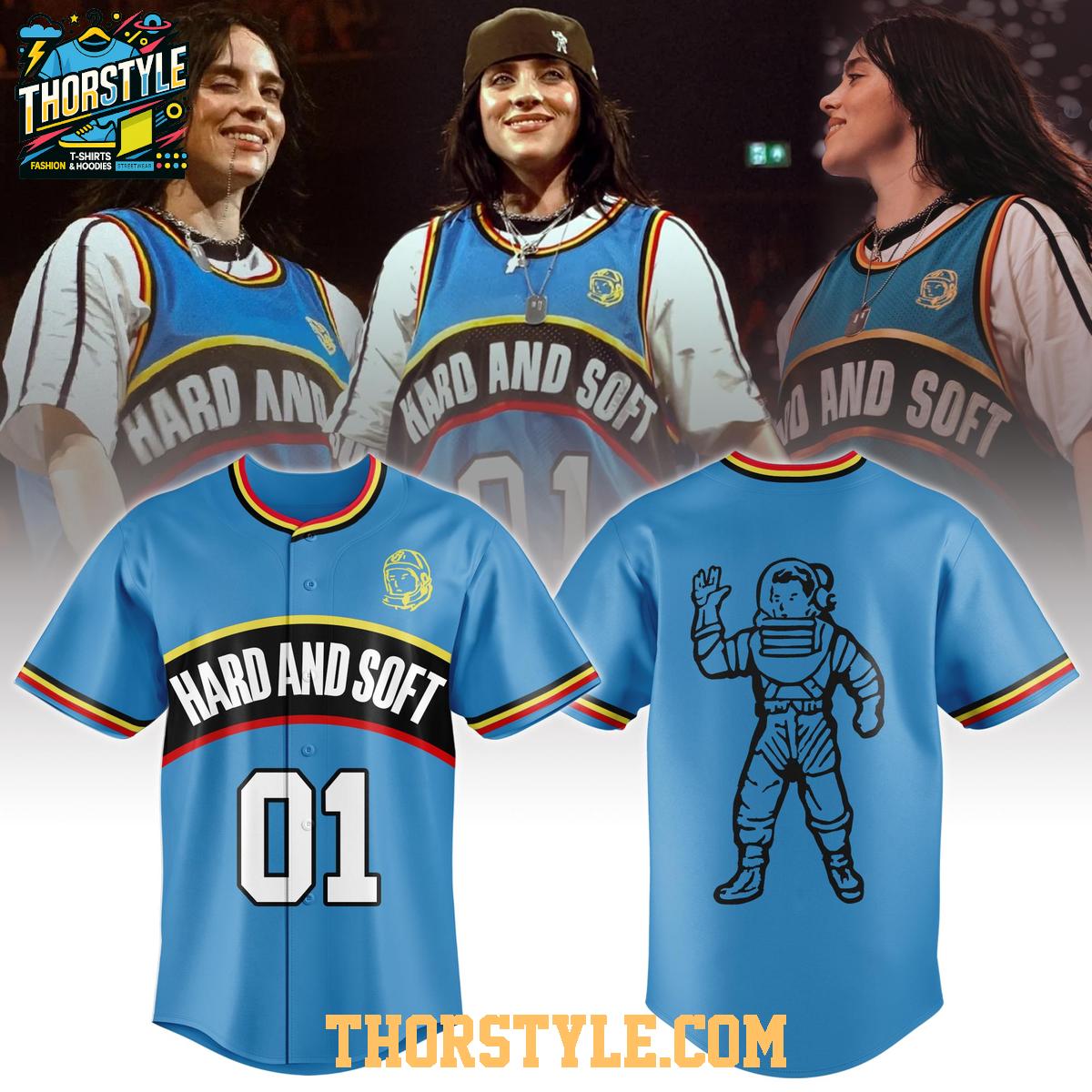 The jersey features a vibrant color palette and bold graphics that capture the essence of both Billie Eilish's edgy style and Billionaire Boys Club's signature space-themed designs. Notice the "Hard and Soft" lettering across the chest, a nod to the contrasting elements often found in both Eilish's music and BBC's design philosophy. On the back, you'll find the classic BBC astronaut logo, a symbol of exploration and innovation.