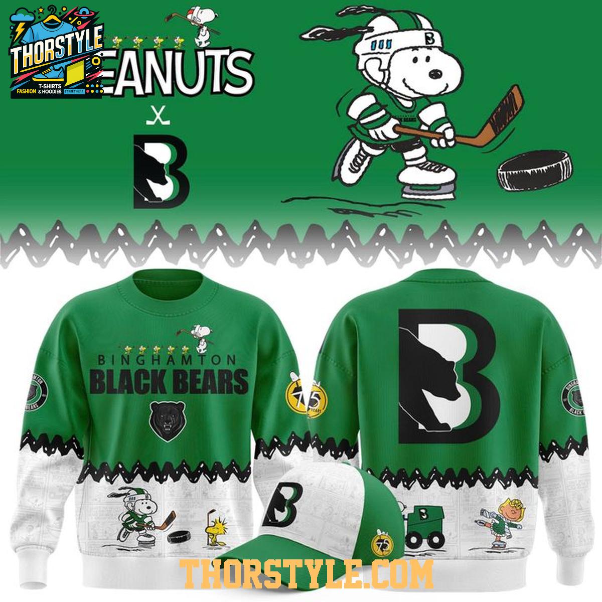 Whether you're heading to a Black Bears game, attending a holiday gathering, or simply want to express your unique style, this hoodie t-shirt is a versatile choice. Pair it with jeans or leggings for a casual look, or dress it up with a skirt and boots for a more fashionable ensemble. Machine washable for easy care, this Binghamton Black Bears Peanuts Christmas Snowy Hockey Day x FPHL Hoodie T-Shirt is designed to be a long-lasting addition to your wardrobe.