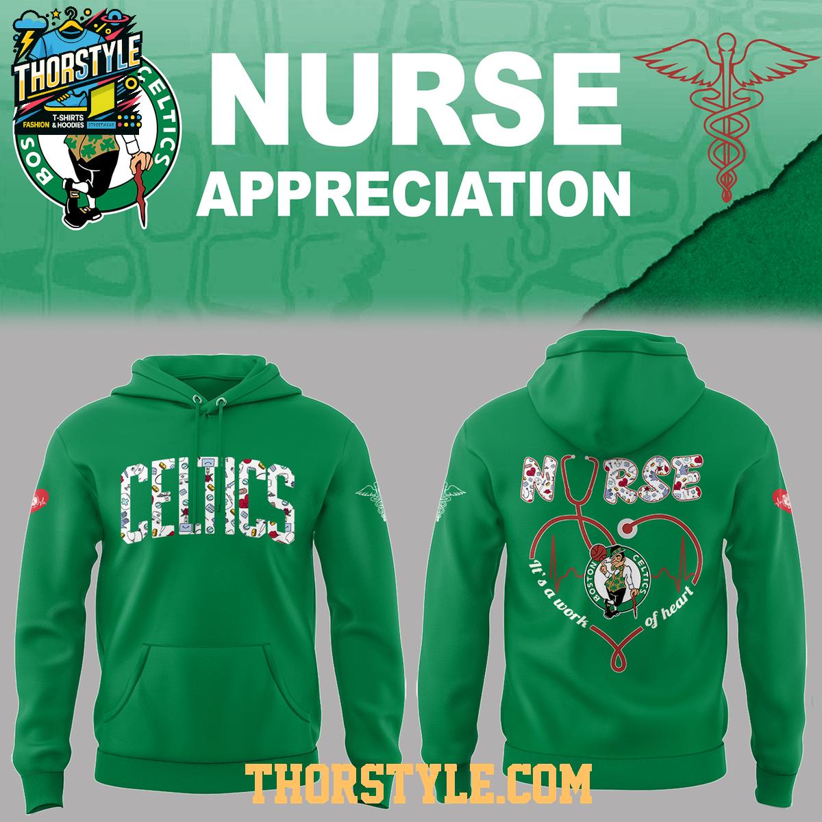 Turning to the back, the word "NURSE" is prominently displayed above a heartwarming graphic. This graphic incorporates a basketball-playing Celtics mascot nestled within a heart, symbolizing the dedication and care that nurses provide. The phrase "It's a work of heart" elegantly complements the design, encapsulating the essence of the nursing profession. Crafted for both comfort and style, this hoodie t-shirt is perfect for game nights at TD Garden, festive holiday gatherings, or comfortable everyday wear. Show your unwavering support for the Boston Celtics and the tireless nurses in our communities with this special, commemorative piece. It's a spirited and thoughtful way to express gratitude and team pride simultaneously.