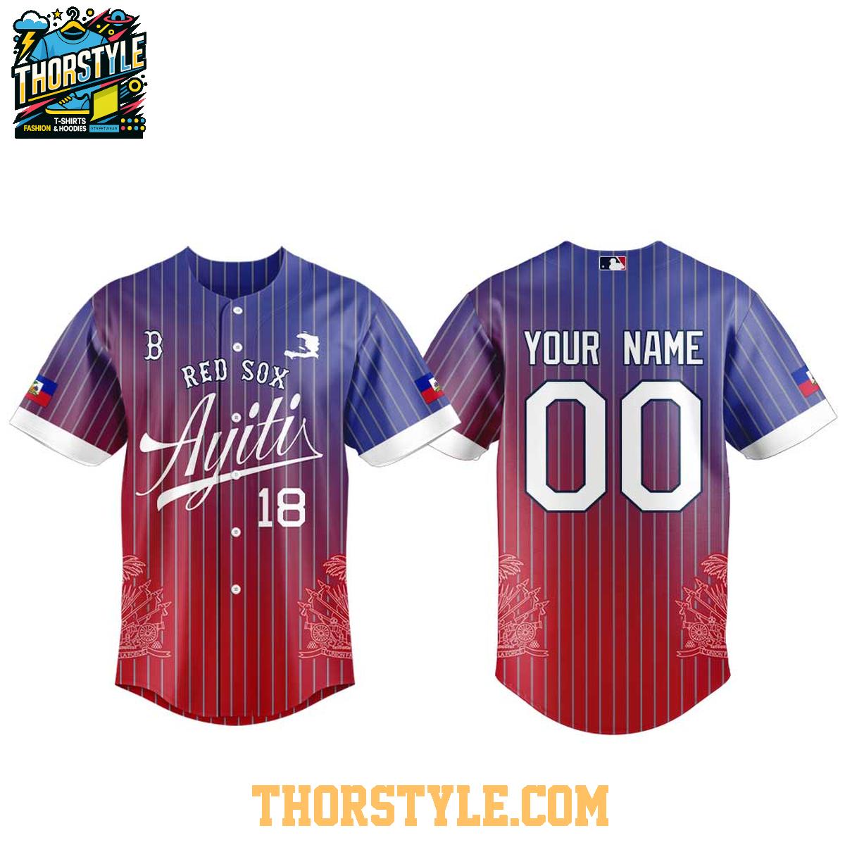 The jersey features a vibrant design incorporating the classic Red Sox colors with Haitian-inspired elements. The front displays the team name and a stylized graphic, while the back proudly showcases your personalized name and number. This customization allows you to truly make the jersey your own, whether you choose your own name, a favorite player's, or a meaningful number.