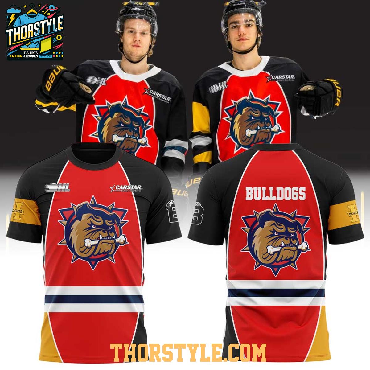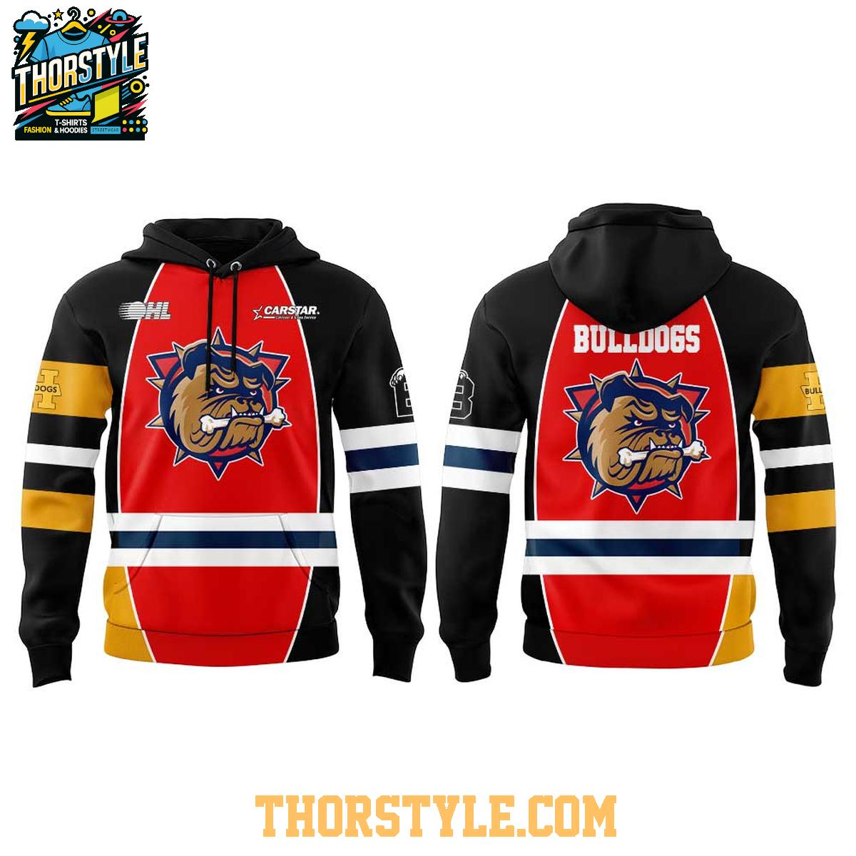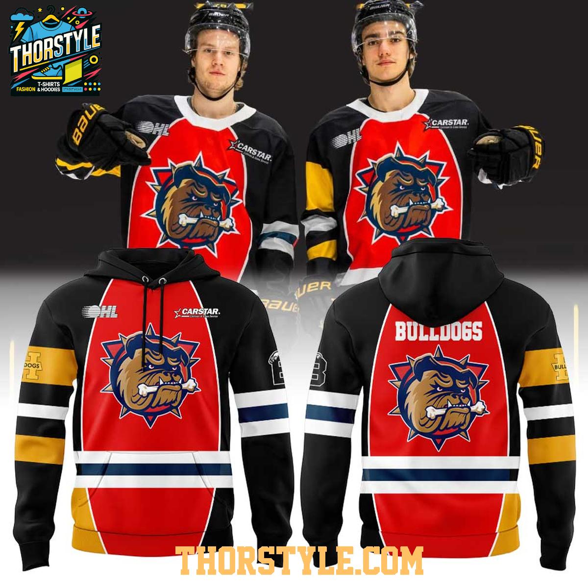 Whether you're heading to the rink to watch the Bulldogs dominate on the ice or meeting up with friends for a casual get-together, this hoodie t-shirt is the perfect way to showcase your team pride. Pair it with jeans, joggers, or shorts for a stylish and comfortable look that's sure to turn heads. The durable construction means it can withstand the rigors of everyday wear, while proper care will help maintain its appearance for seasons to come. Represent the future of Brantford Bulldogs hockey with this commemorative apparel.