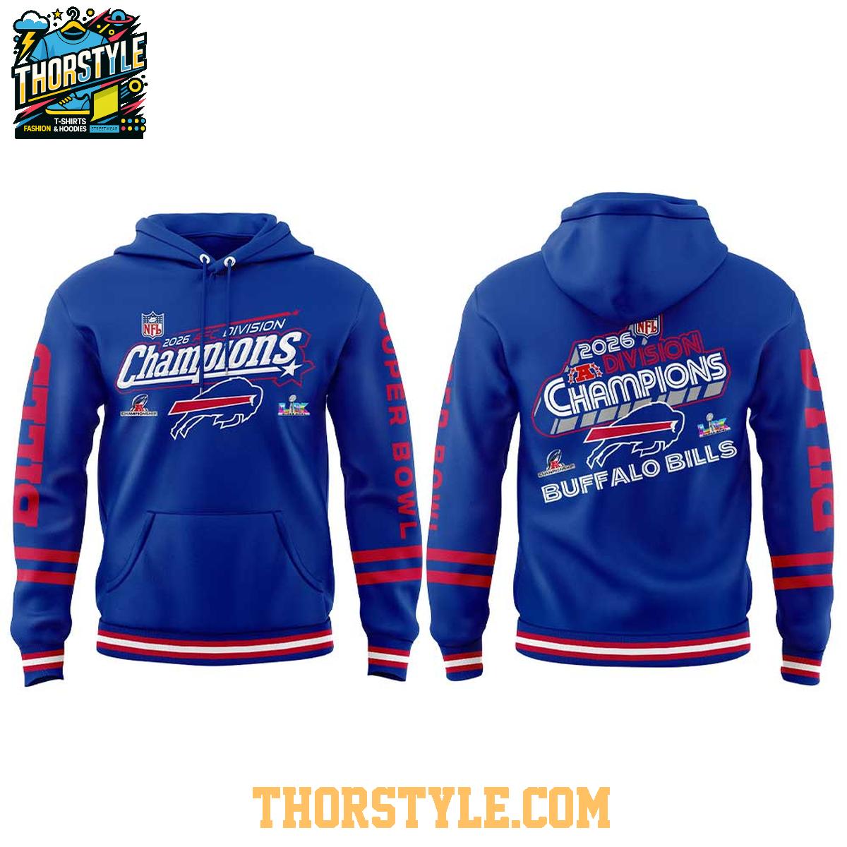 The design features bold graphics commemorating the Bills' AFC Division Championship victory in 2026. The front prominently displays the team logo and "Champions" lettering, while the back showcases additional celebratory details. The hoodie itself is constructed with a comfortable drawstring hood and a classic kangaroo pocket, providing both style and functionality. The ribbed cuffs and hem enhance the fit and add to the overall durability of the garment.