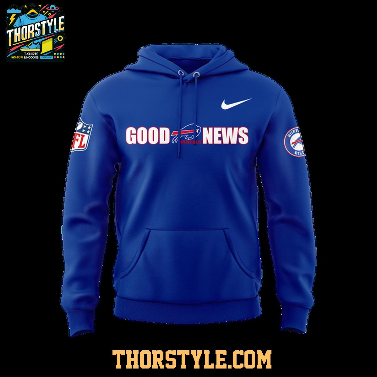 This hoodie t-shirt seamlessly blends the comfort of a classic tee with the cozy style of a hoodie. The vibrant team colors and bold "Good News" graphic across the chest instantly identify you as a dedicated Bills supporter. On the back, the iconic Buffalo Bills logo is prominently displayed, leaving no doubt about your allegiance. It's perfect for game days, casual outings, or simply relaxing at home while representing your team.