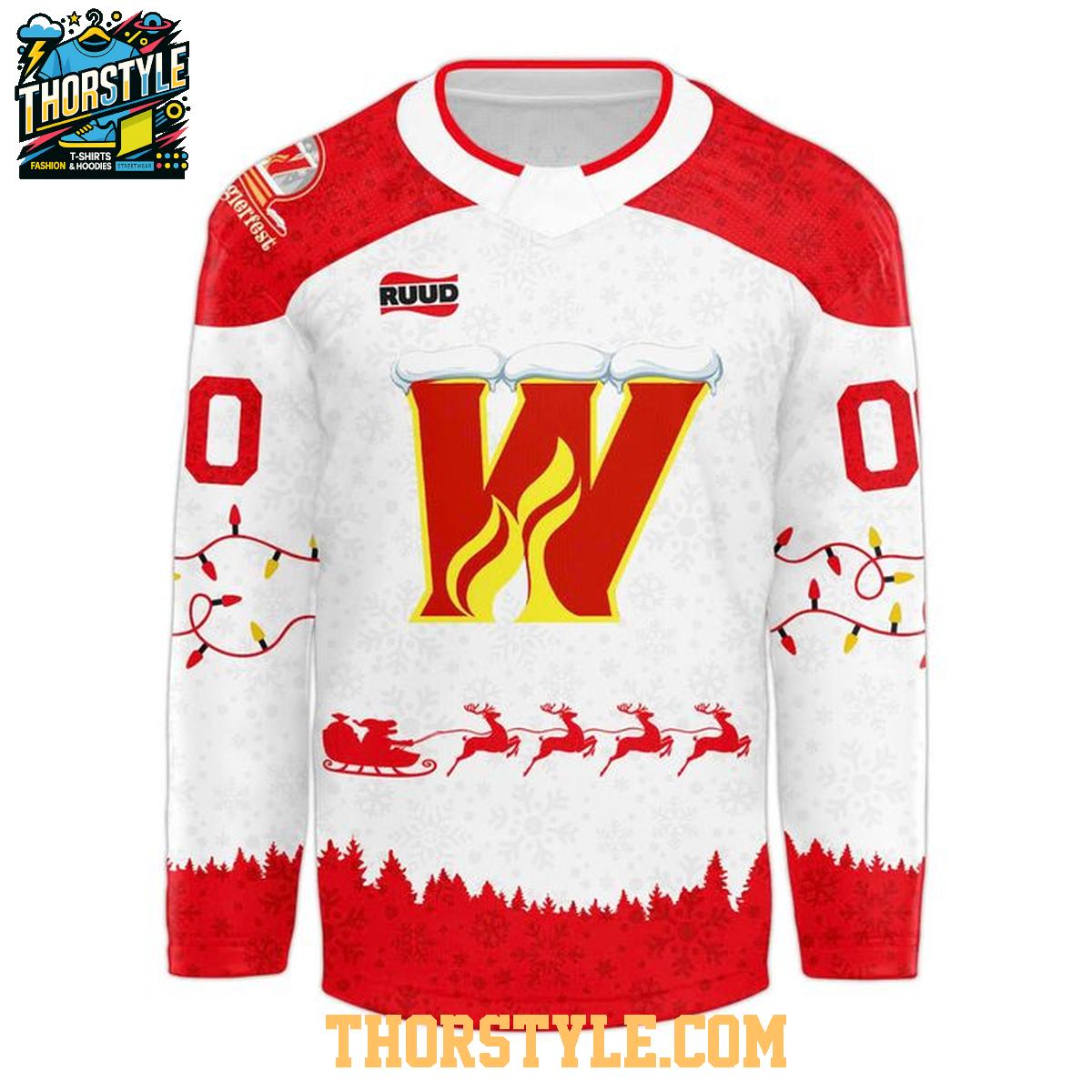This hockey jersey features the Wranglers' team colors and logo, integrated with a fun, wintry design. Intricate detailing, like the festive accents along the sleeves and hem, makes it perfect for wearing to games, holiday gatherings, or simply as a statement piece during the winter season. The jersey is made from breathable, durable fabric, designed to keep you comfortable whether you're cheering from the stands or wearing it casually around town.