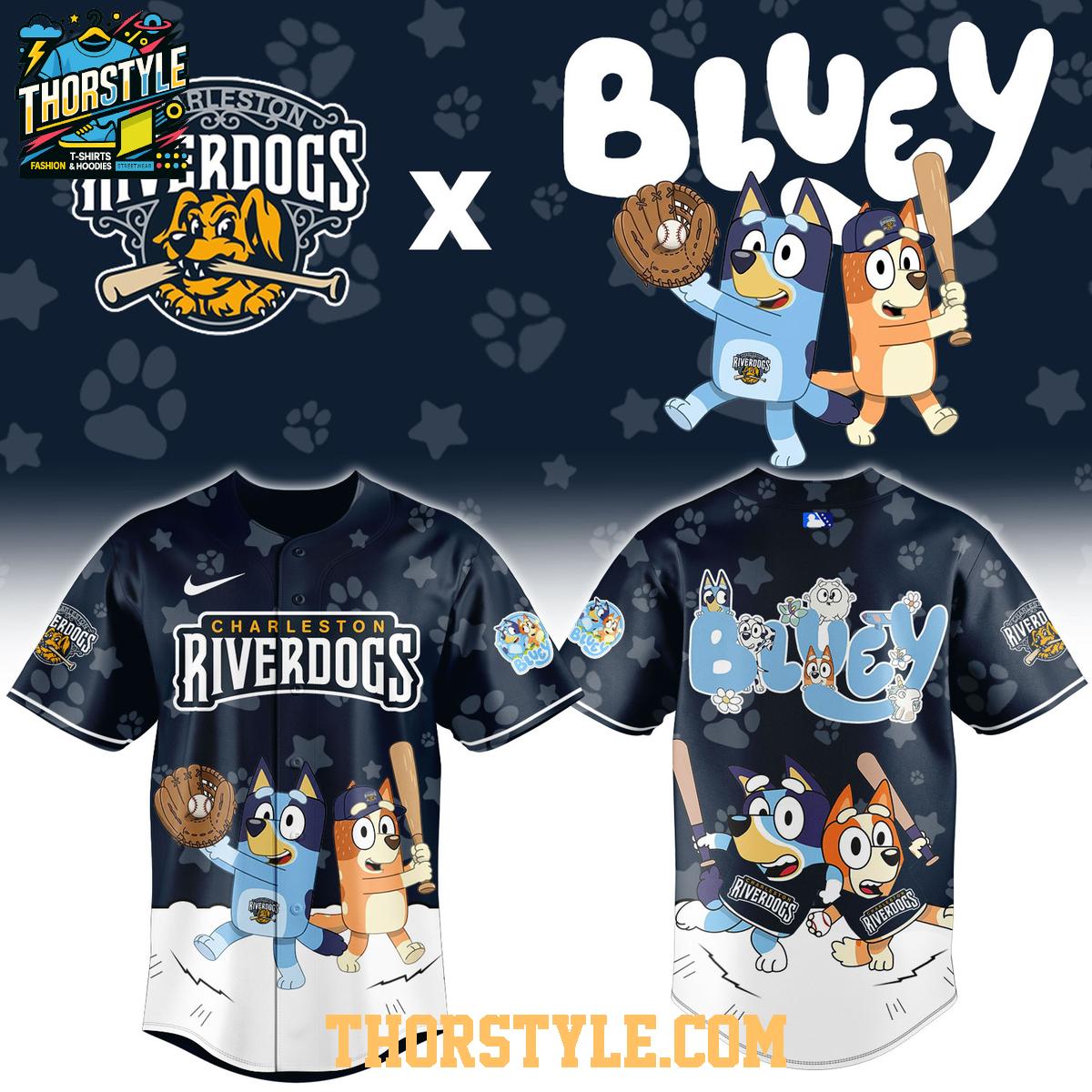 This eye-catching jersey features vibrant graphics that seamlessly integrate the Charleston RiverDogs logo with Bluey and Bingo in action poses. The front prominently displays the team name, while the back showcases "Bluey" in a playful font, surrounded by character imagery. The overall design captures the spirit of the game and the show, making it a standout piece for any fan's wardrobe.