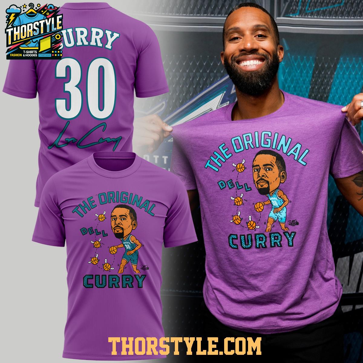 This hoodie t-shirt features a vibrant design that pays homage to Dell Curry's time with the Hornets. The front displays a stylized graphic with "The Original" Dell Curry artwork, while the back proudly showcases "Curry" and his iconic number "30." The design is eye-catching and instantly recognizable, making it a great conversation starter for fellow basketball fans. The blend of t-shirt and hoodie elements offers a relaxed yet stylish look.