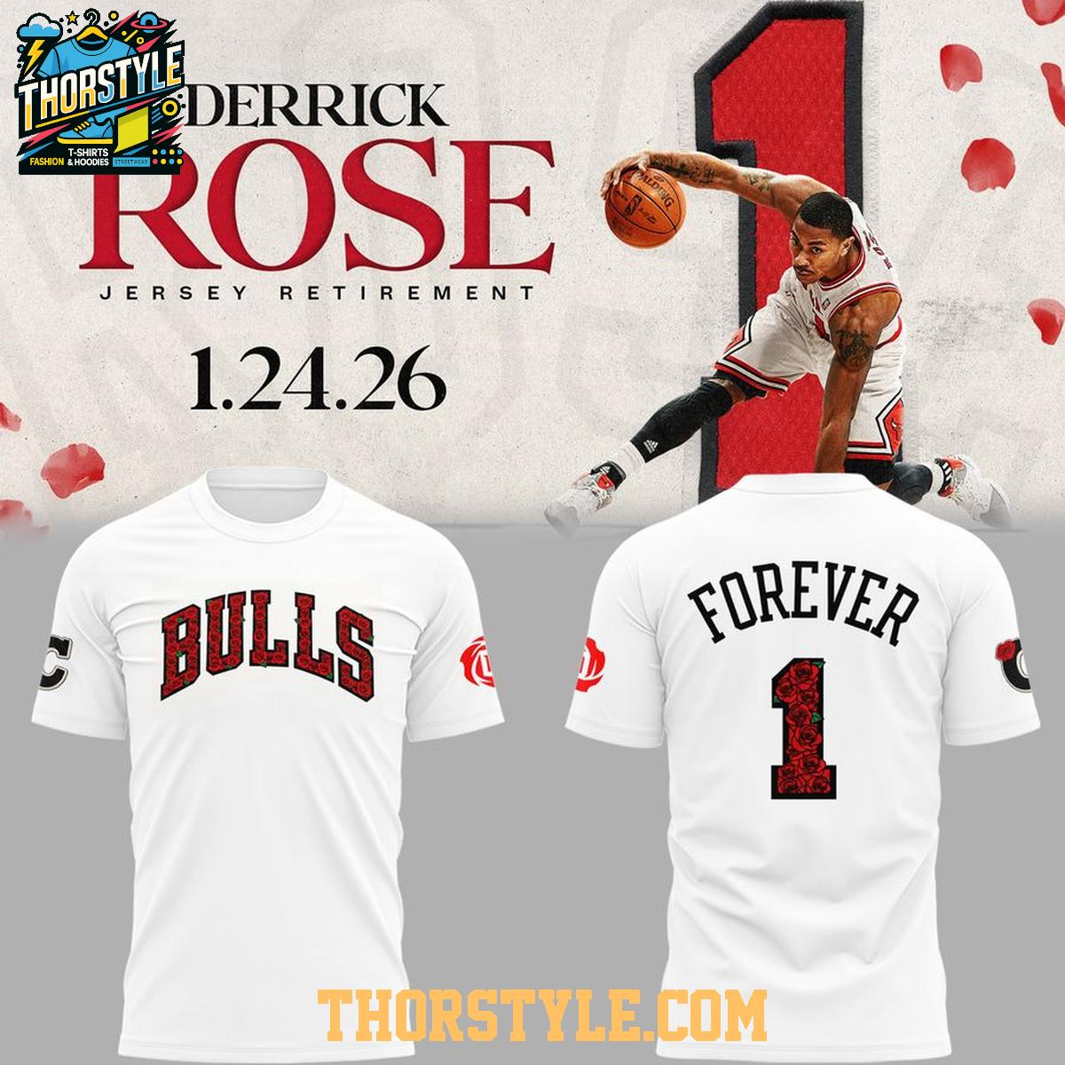 This hoodie t-shirt masterfully combines the relaxed comfort of a t-shirt with the distinctive style of a hoodie. The front proudly displays "BULLS" in a bold, classic font, instantly recognizable to any fan. Turning to the back, "FOREVER" is emblazoned above the iconic number 1, Rose's celebrated jersey number. The number 1 is filled with a striking rose pattern, a fitting and artistic representation of his name and enduring legacy. Rose graphics are also incorporated onto the sleeves, details true fans will appreciate.