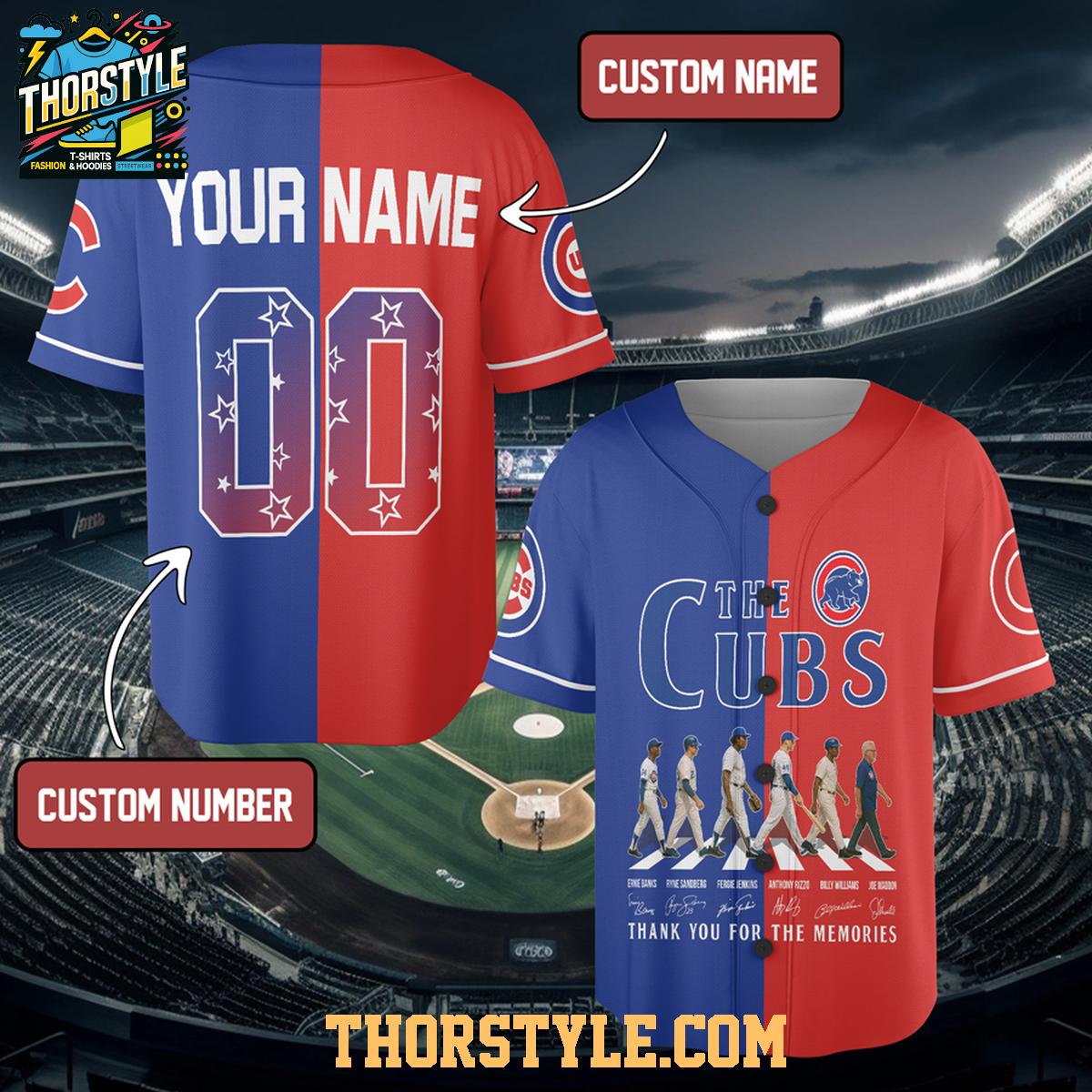 Crafted with a striking split blue and red design, this jersey immediately captures the iconic Cubs aesthetic. The front proudly displays "THE CUBS" alongside the classic bear logo, beneath which an iconic lineup of players, including Ernie Banks, Ryne Sandberg, and Anthony Rizzo, are depicted walking together. This powerful visual is accompanied by a genuine "THANK YOU FOR THE MEMORIES" message, thoughtfully honoring the heroes who have profoundly shaped Cubs history and created countless unforgettable moments for fans.