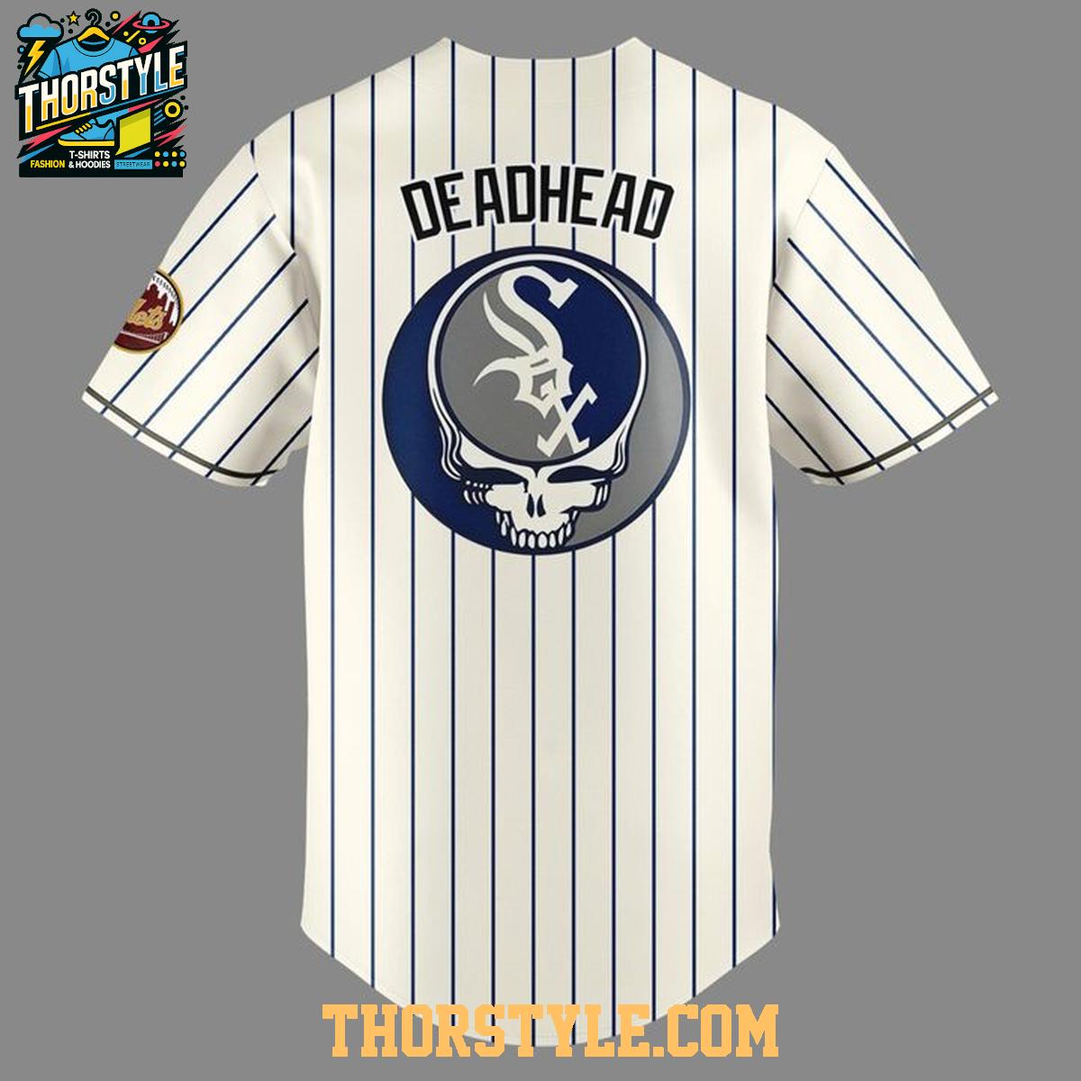 The design features classic baseball pinstripes, instantly recognizable on a baseball jersey. The front proudly displays "Grateful Dead" in a vintage-inspired font, paying homage to the band's signature style. On the back, "Deadhead" is emblazoned above a unique logo that blends the Grateful Dead's iconic imagery with the White Sox team emblem. This jersey is a conversation starter and a statement piece that showcases your diverse interests.