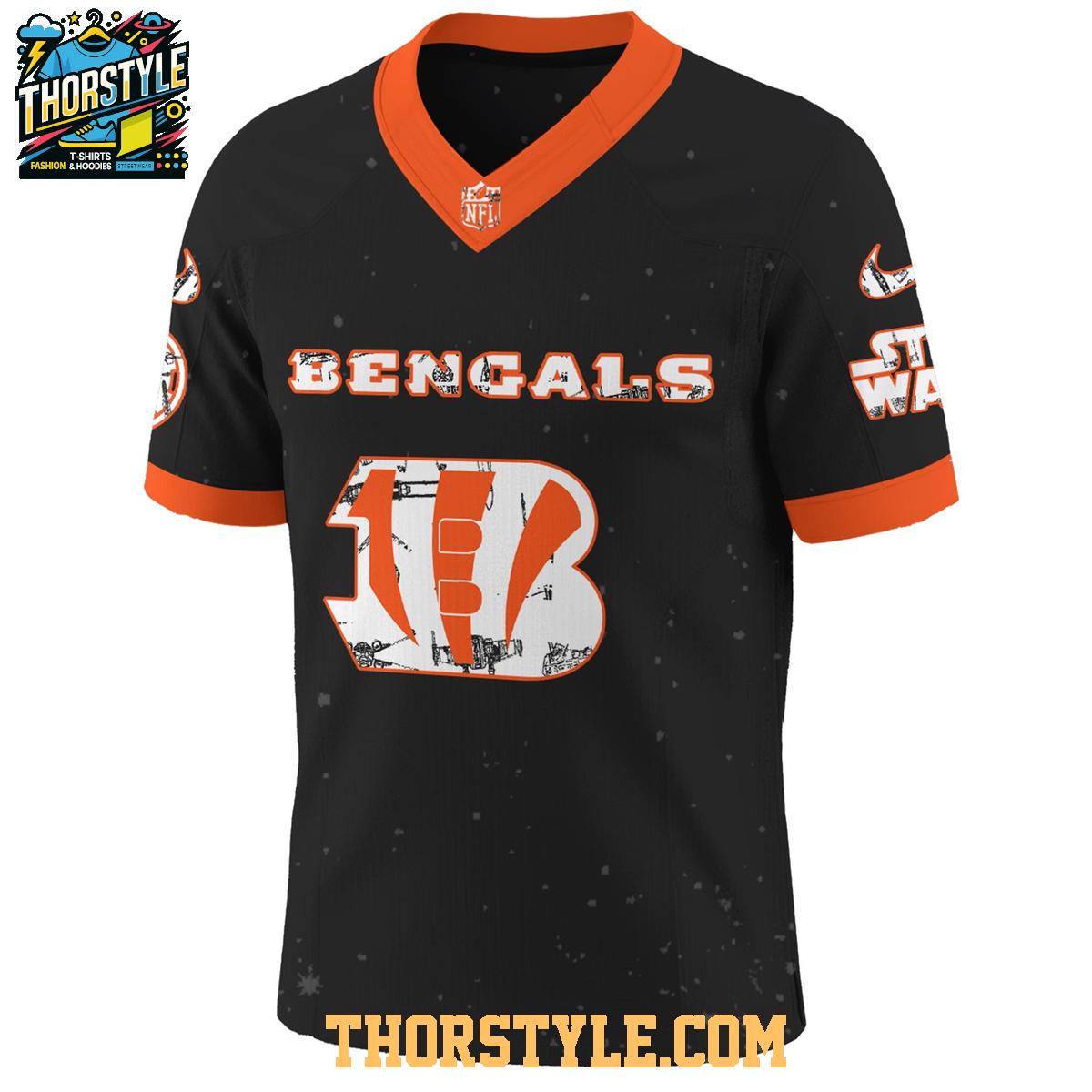 Crafted for the most dedicated supporters, this unique Bengals Star Wars jersey boasts a striking design that seamlessly integrates the Bengals' signature team colors and emblem with Darth Vader's unmistakable helmet and menacing aesthetic. Every detail is considered, creating a truly unique visual statement. The "2025" designation signifies a special, limited edition release, elevating this jersey to a highly prized collector's item for both passionate Cincinnati football enthusiasts and discerning Star Wars aficionados seeking exclusivity and authenticity.