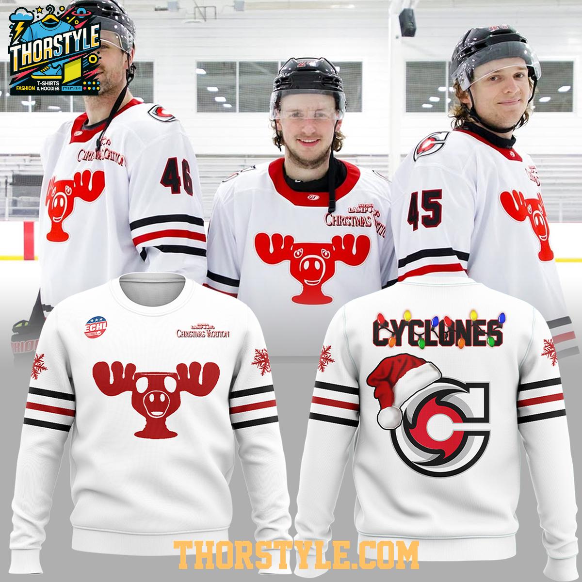The design features a playful reindeer graphic cleverly incorporating the Cyclones' iconic colors and logo, all set against a backdrop of delightful holiday-themed elements. On the back, the team name "Cyclones" is prominently displayed above a team logo cheerfully adorned with a Santa hat, adding an extra touch of seasonal cheer. The sleeves incorporate a bold striped design, enhancing the overall visual appeal.