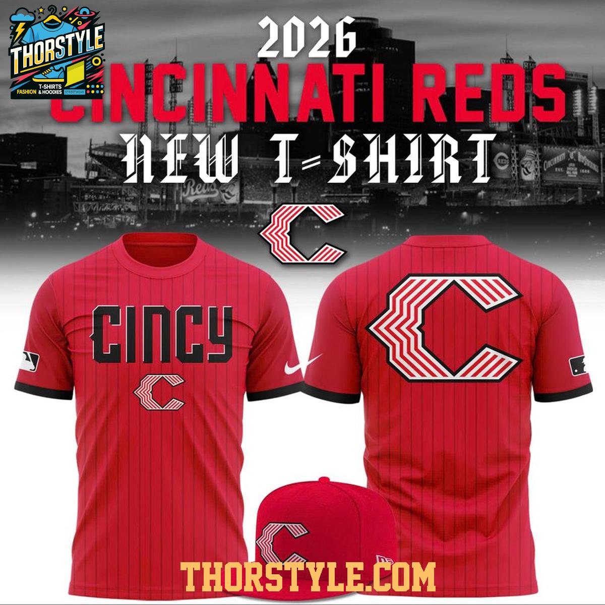 ,Cincinnati Reds New Uniform All Red 2026 Hoodie T-Shirt Striped Version
