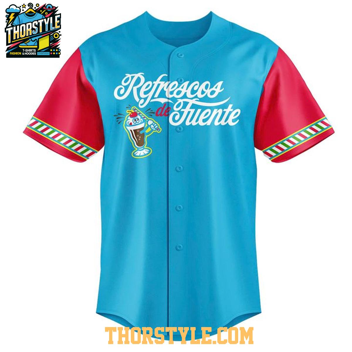 Crafted from breathable, lightweight polyester fabric, this jersey is designed for comfort whether you're at the ballpark, hanging out with friends, or simply want to add some sporty flair to your everyday wardrobe. The full-button front allows for versatile styling – wear it buttoned up for a traditional look or open over your favorite t-shirt for a more relaxed vibe. The jersey features eye-catching graphics inspired by the "Refrescos de Fuente" theme, making it a conversation starter wherever you go.