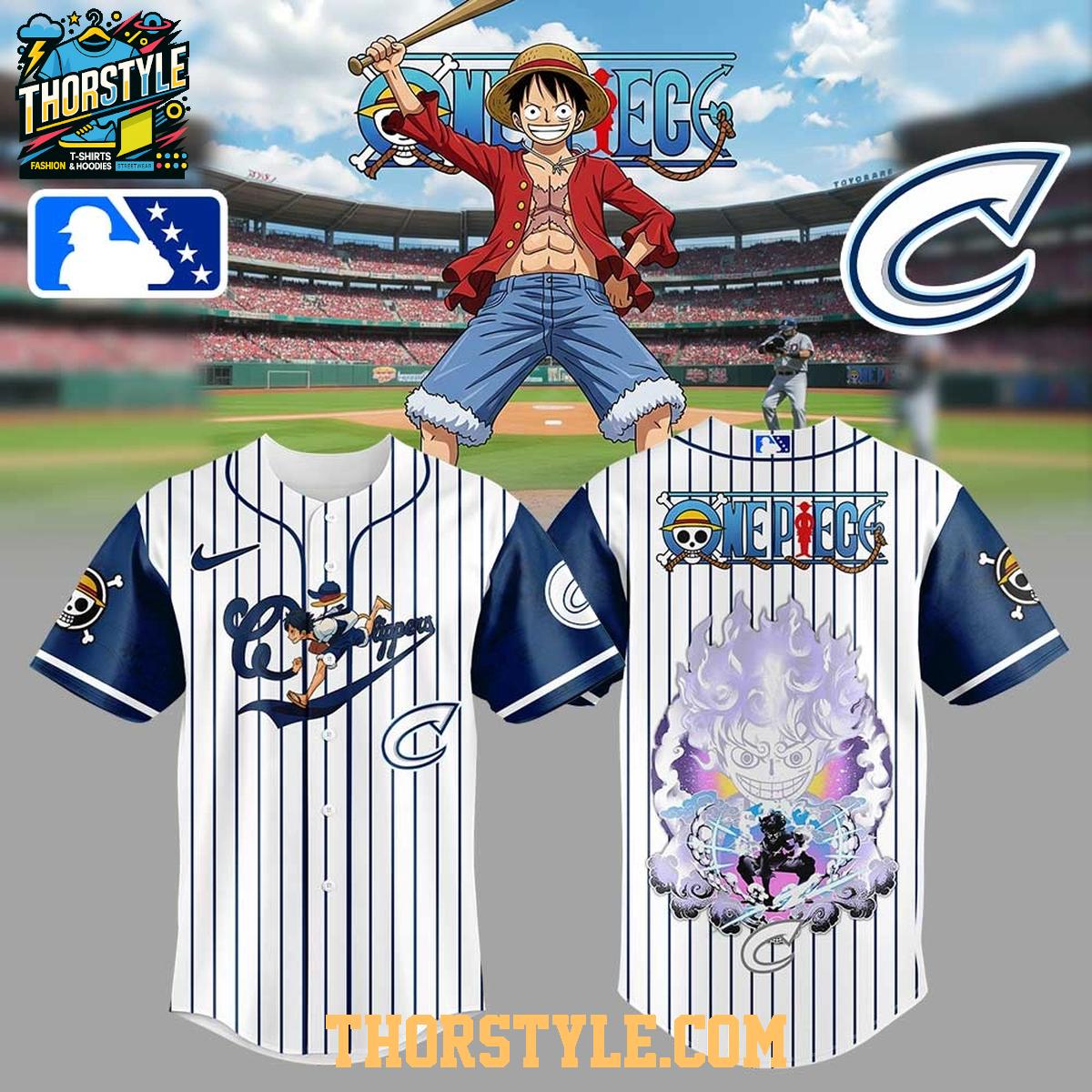 Crafted for both style and practicality, the jersey features a comfortable and breathable fabric, ensuring a pleasant wearing experience. The design showcases the Columbus Clippers logo alongside carefully integrated elements inspired by the Straw Hat Crew, resulting in a visually striking and memorable aesthetic. The traditional pinstripe pattern adds a touch of timeless baseball flair, while the anime-inspired graphics inject a modern and exciting twist.