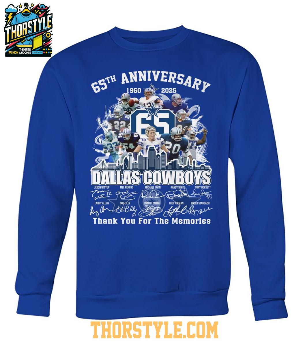 The shirt's captivating graphic showcases a dynamic collage of legendary Dallas Cowboys players, each figure a pillar in the team's illustrious journey. Iconic names such as Troy Aikman, Emmitt Smith, Michael Irvin, Roger Staubach, and Jason Witten are prominently featured, their reproduced signatures adding an authentic, collectible dimension that true football enthusiasts will deeply appreciate. Anchoring this powerful visual is a bold "65" emblem, a clear symbol of the enduring legacy, rich history, and sustained success that the Dallas Cowboys franchise has built over more than six decades.