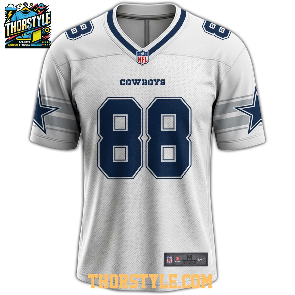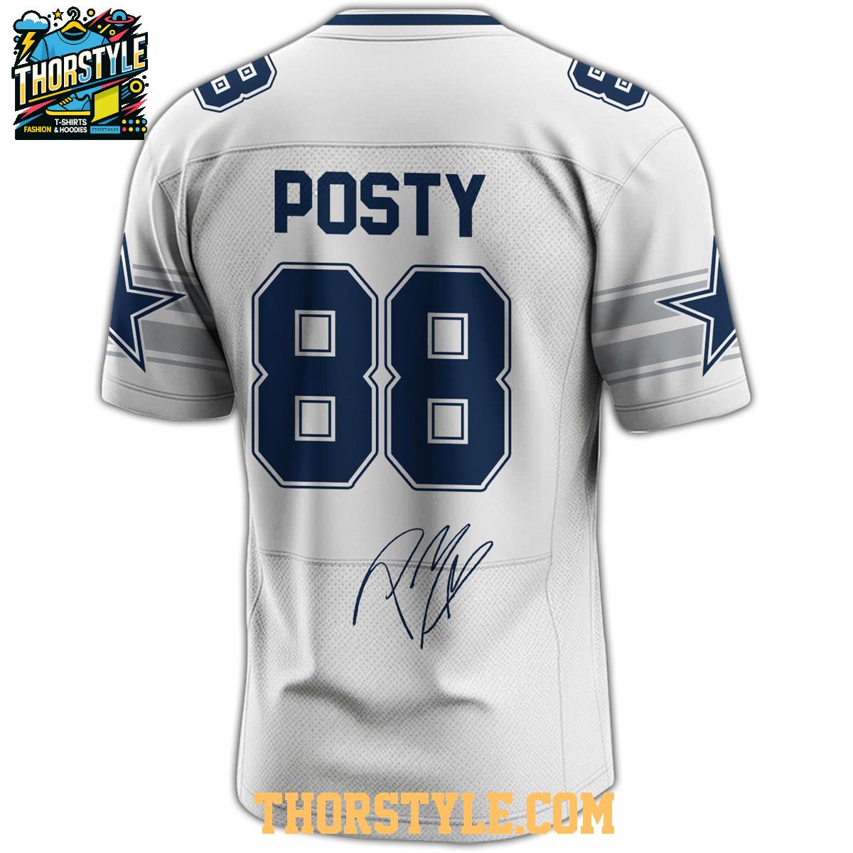 The jersey proudly displays the Cowboys' iconic star logo and team name, instantly recognizable symbols of America's Team. Adding a personalized touch, the number 88 is prominently featured in bold navy lettering, a nod to the legacy of Cowboys receivers. However, the true distinction lies in the substitution of the traditional player name with "POSTY" emblazoned across the back, accompanied by a stylized autograph beneath the number, solidifying its unique design. The classic white base of the jersey, harmonized with the sharp navy accents, results in a clean and effortlessly stylish look suitable for various occasions.