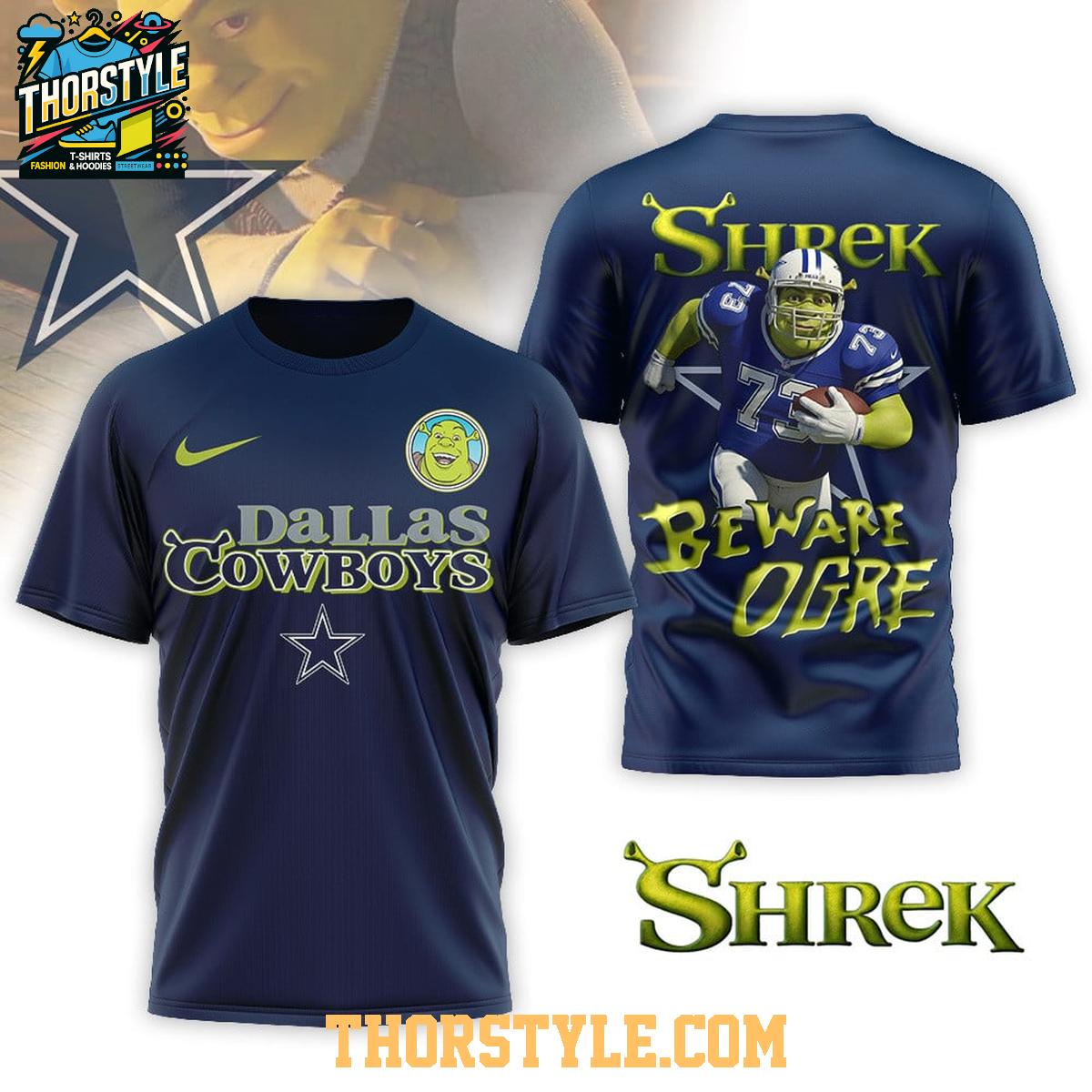 This eye-catching shirt features a creative design showcasing Shrek as a powerful player, ready to dominate the field. The front proudly displays the Dallas Cowboys logo alongside a playful Shrek graphic, while the back amps up the fun with "Beware Ogre" emblazoned across the shoulders, alongside a full figure of Shrek in Cowboys gear. The comfortable, relaxed fit makes it ideal for game days, holiday gatherings, or just lounging around showing off your unique style.