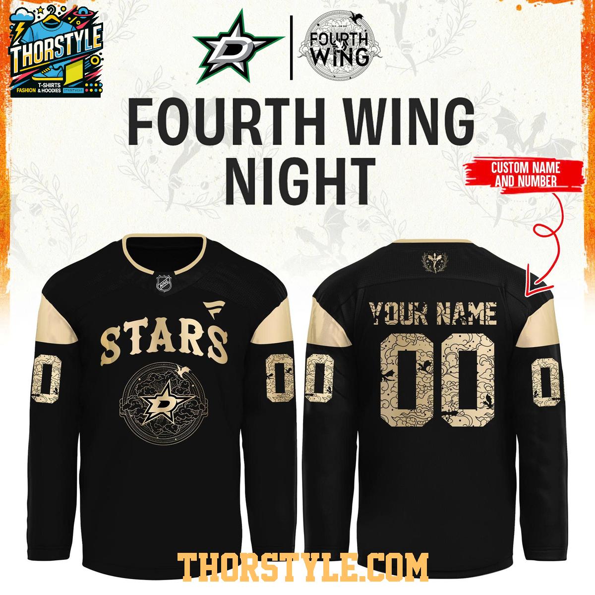 Celebrate the Dallas Stars and their unique partnership with this Dallas Stars Fourth Wings Night 2025 Dark Personalized Hockey Jersey. This special edition jersey commemorates the exciting Fourth Wings Night, offering fans a distinctive way to show their support. The design blends the classic Stars aesthetic with elements inspired by the Fourth Wings theme, creating a visually striking and memorable piece of fan apparel.