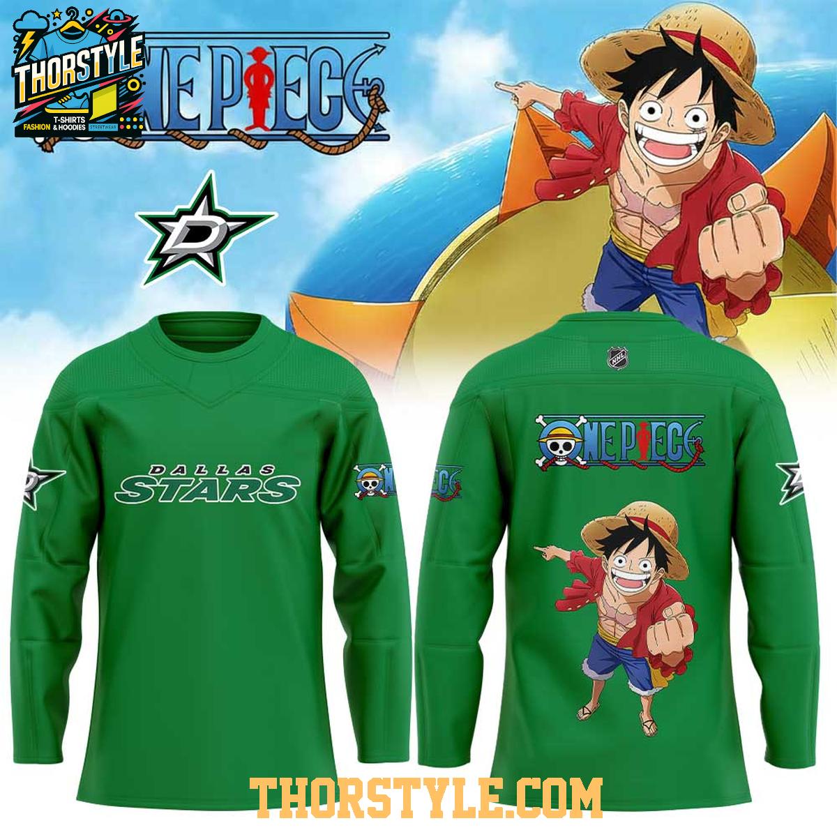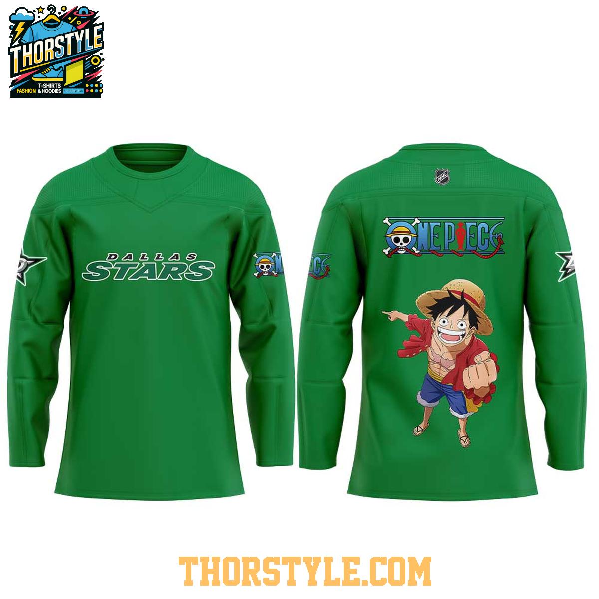 This unique hockey jersey features the iconic green and black colors of the Dallas Stars, prominently displaying the team's name and logo on the front. On the back, you'll find imagery inspired by One Piece, including a rendering of Monkey D. Luffy, the captain of the Straw Hat Pirates. The blend of hockey and anime elements creates a bold and eye-catching design.