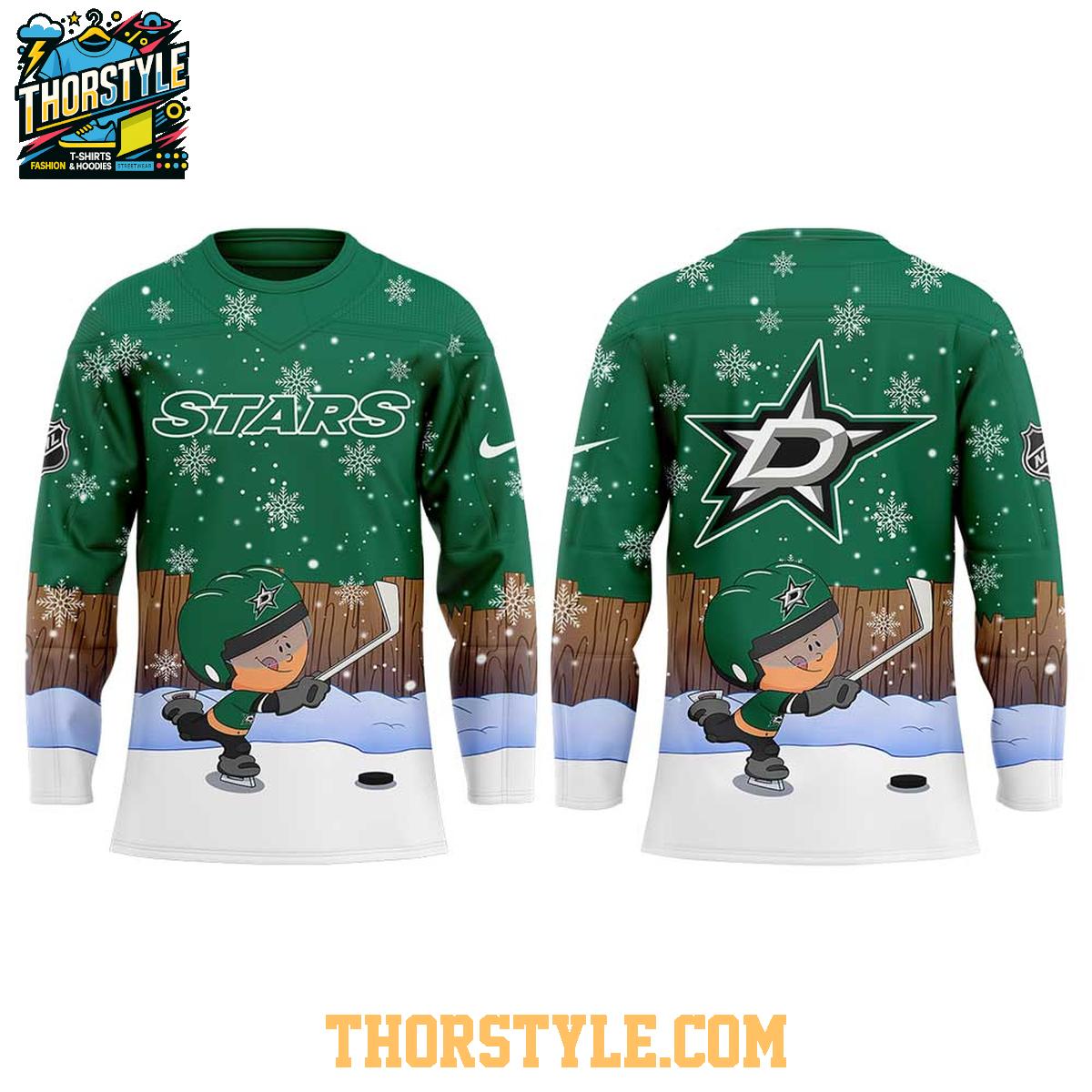 This custom hockey jersey features the iconic Dallas Stars logo prominently displayed, along with wintery snowflakes. The design incorporates a playful graphic of Pablo Sanchez in a hockey setting, adding a touch of whimsical charm. Personalization options allow you to add your own name and number, making it a truly one-of-a-kind garment.