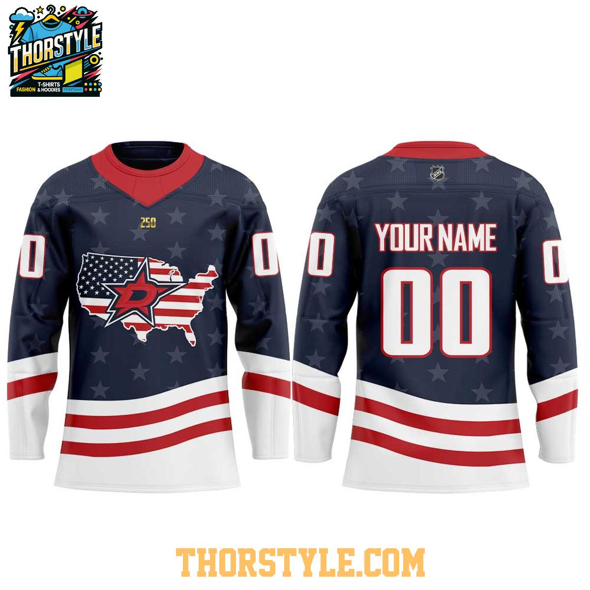 The jersey features a distinctive design incorporating patriotic elements. The Stars logo is set against a backdrop inspired by the American flag, creating a visually striking and meaningful representation. The blend of the team's colors with the national colors makes it a standout piece, suitable for game days or casual wear. The placement of stars and stripes is thoughtfully executed, ensuring a balanced and aesthetically pleasing look.