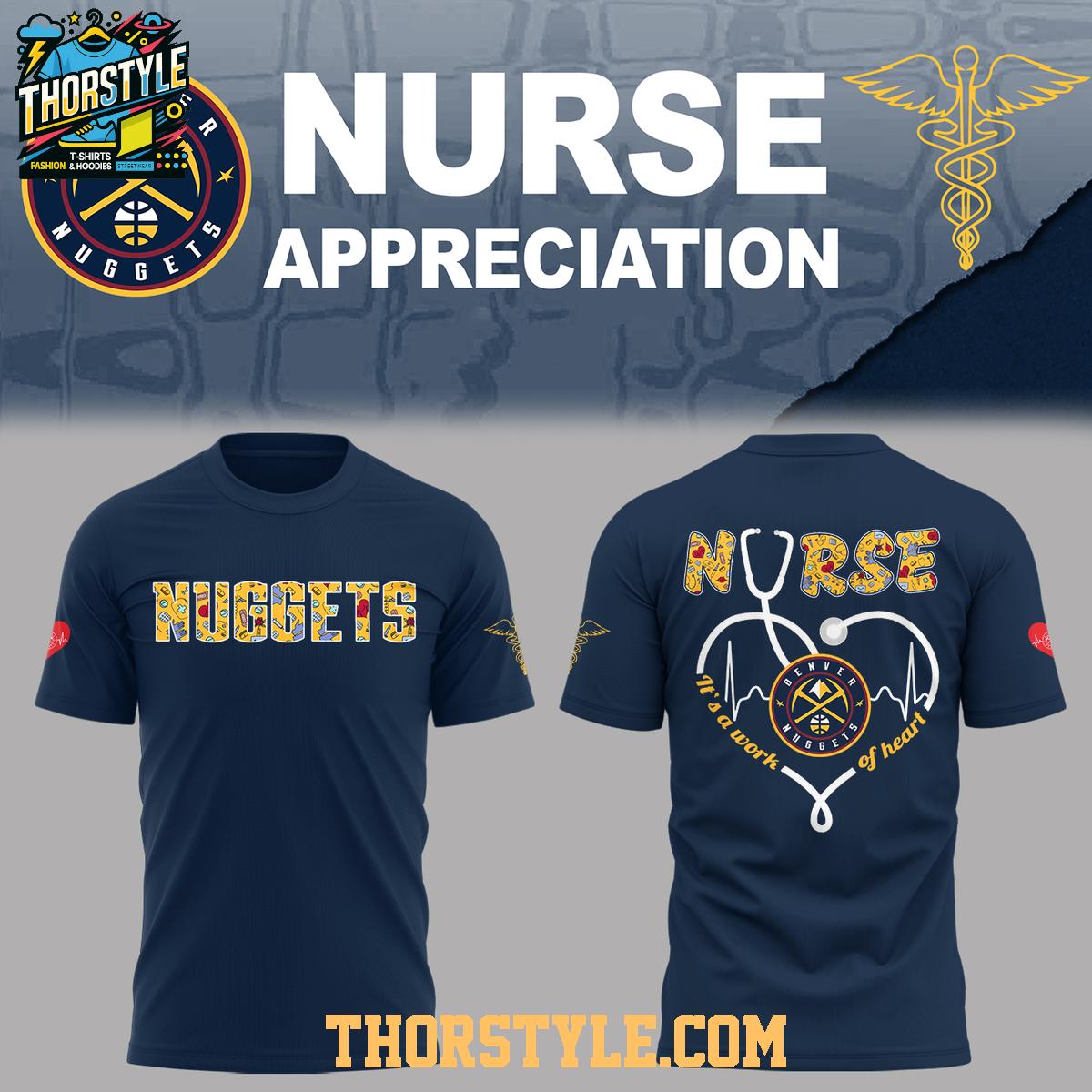 The design features prominent "Nuggets" lettering across the front, instantly identifying your allegiance. The back showcases a heartfelt tribute to nurses, displaying the word "Nurse" above a carefully integrated design. A heart encompasses both the Denver Nuggets logo and the caduceus symbol, universally recognized as a symbol of medicine. The phrase "It's a work of heart" further emphasizes the compassion and dedication inherent in the nursing profession.