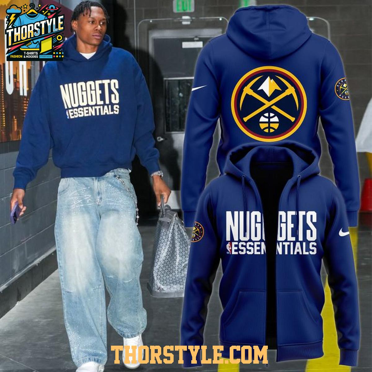 The design features bold "Nuggets Essentials" graphics prominently displayed on the front, instantly showcasing your unwavering team pride. The iconic Denver Nuggets logo is subtly and tastefully incorporated into the design, adding a touch of authenticity and visual appeal. The hoodie element provides added warmth and stylish flair, while the short sleeves ensure you remain cool and comfortable, even during intense game moments.