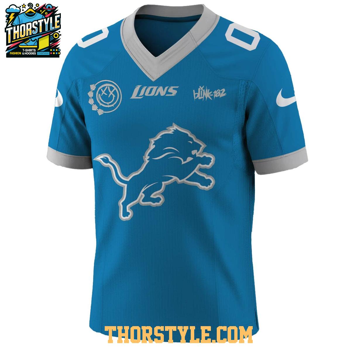 The fit is designed to be comfortable and athletic, allowing for a full range of motion. It's ideal for layering over a t-shirt or wearing on its own during warmer weather. Whether you're tailgating with friends, attending a Lions game, or simply want to express your unique style, this personalized football jersey is the perfect choice. To keep your jersey looking its best, we recommend machine washing it inside out on a gentle cycle and air drying. This will help preserve the colors and graphics for seasons to come. Show off your passion for the Lions and Blink-182 with this custom-designed jersey.