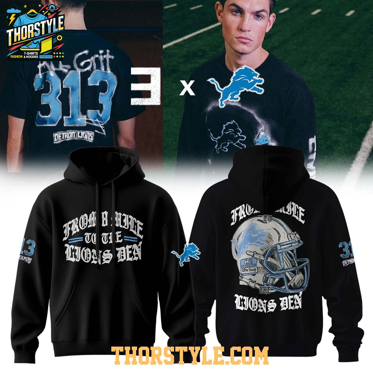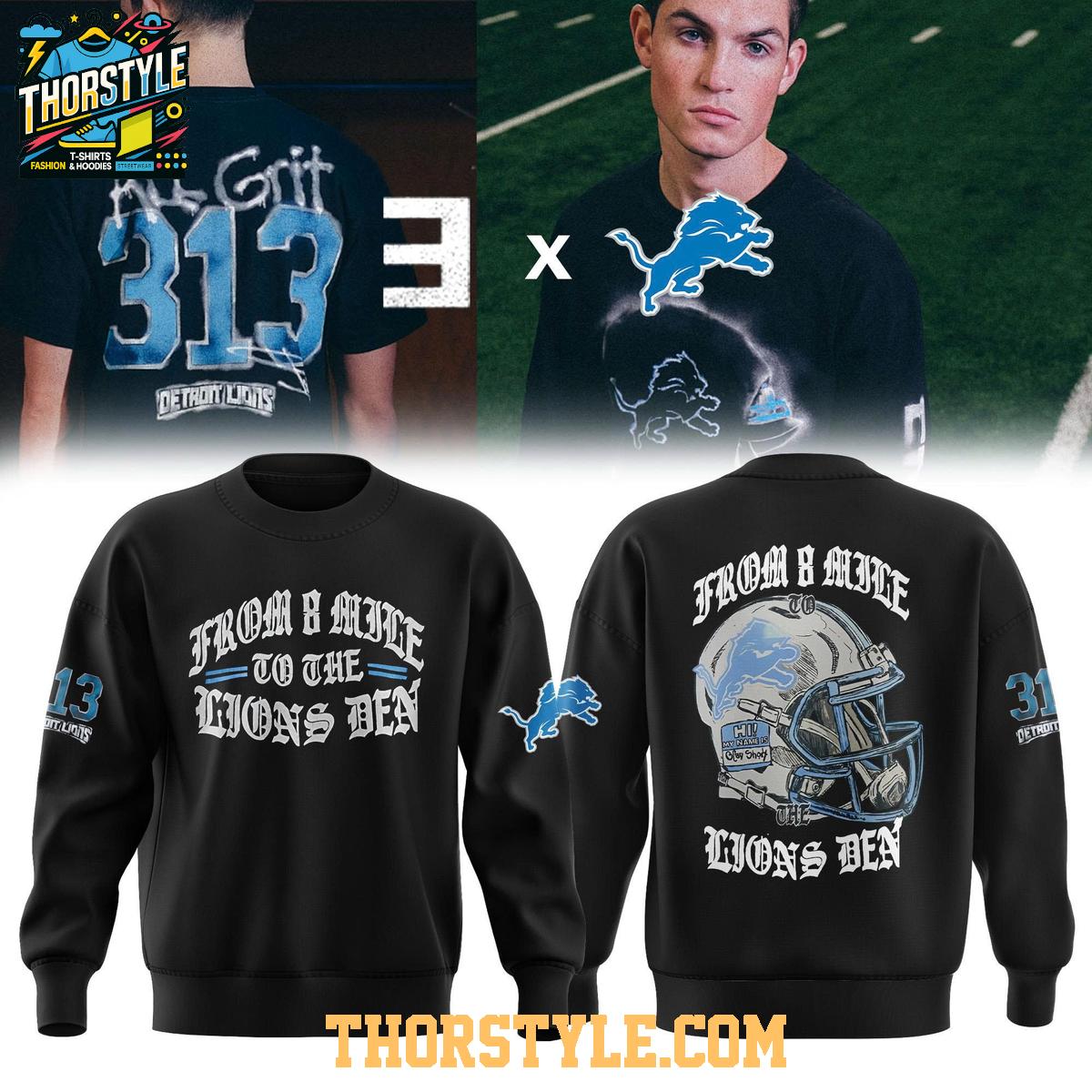 This hybrid garment features a comfortable hoodie design with the lightweight feel of a t-shirt. The graphics showcase bold Detroit Lions elements alongside Eminem-inspired artwork, making it a standout piece whether you're at Ford Field or just hanging out. The design incorporates the "313" area code, a strong symbol of Detroit's identity, and other details that resonate with both Lions fans and Eminem's dedicated following.