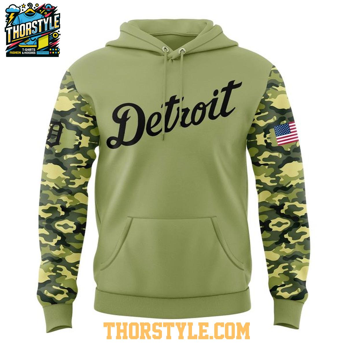 This unique garment features a striking camouflage pattern adorning the sleeves, lending a touch of rugged sophistication to the design. The front proudly showcases "Detroit" in an elegant, classic script font, while the back boldly displays the iconic Tigers logo, ensuring your team spirit is unmistakable. A discreet yet impactful American flag patch on the sleeve serves as a constant reminder of your national pride. The main body of the hoodie is rendered in a solid color, carefully chosen to complement the camouflage sleeves and create a visually appealing contrast.