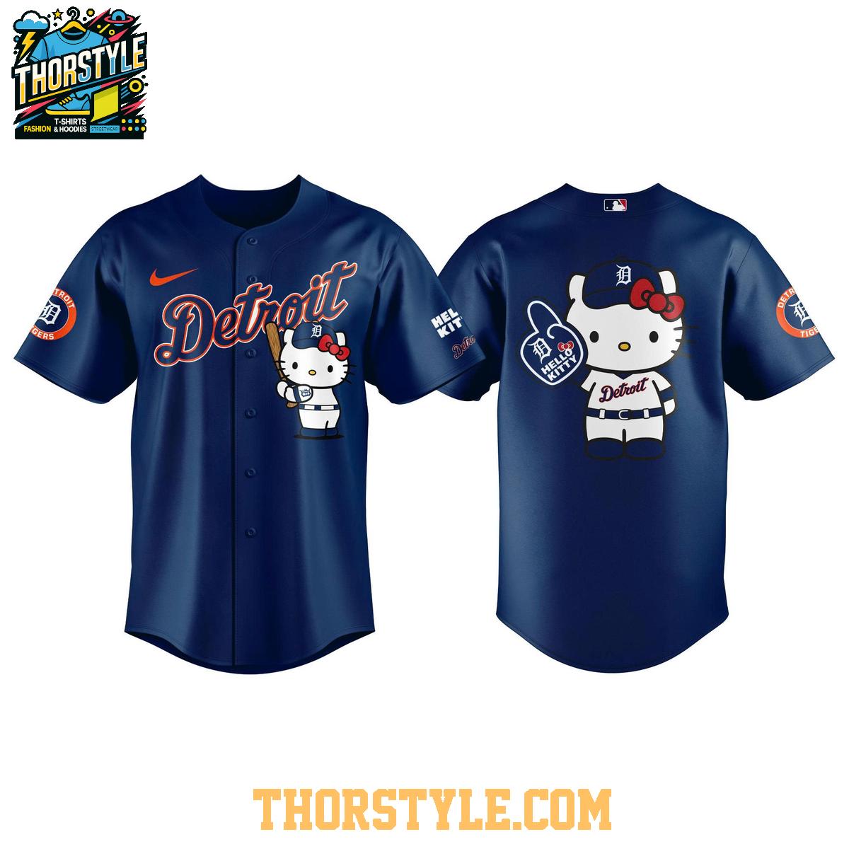 Step up to the plate in style with the limited-edition Detroit Tigers x Hello Kitty 2026 Theme Night Baseball Jersey in Navy. This unique jersey celebrates the beloved Detroit Tigers and the iconic Hello Kitty in a fun and spirited collaboration, perfect for showing your team pride with a touch of kawaii charm. A must-have for any Tigers fan looking to add a distinctive piece to their collection, or for Hello Kitty enthusiasts wanting to express their love for baseball.