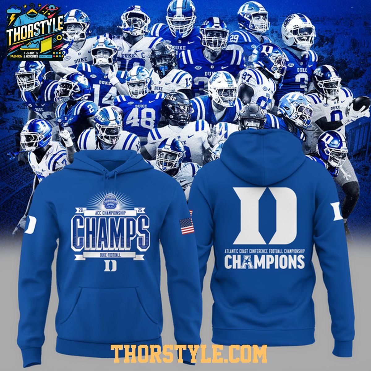 The design features a classic hoodie silhouette with a comfortable hood and a relaxed fit. The front proudly displays the "ACC Championship" and "CHAMPS" design, along with "Duke Football" and the iconic Duke "D". On the back, a large "D" and "Champions" boldly proclaims the team's achievement. The American flag on the sleeve adds a patriotic touch.