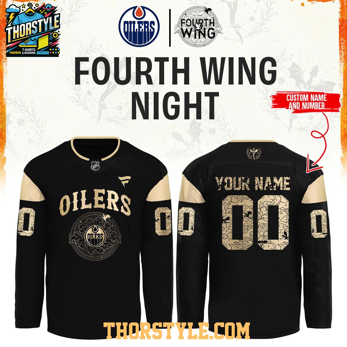 The design features the iconic Oilers logo, seamlessly integrated with exclusive elements celebrating Fourth Wings Night, creating a visually striking and memorable tribute. The sophisticated dark color scheme, accentuated with carefully chosen contrasting accents, ensures this jersey will be a standout piece in any Oilers fan's collection. Personalize it with your name and preferred number to create a truly unique and cherished item, reflecting your individual connection to the team. The meticulous quality construction guarantees that all personalized details are securely and durably applied, built to withstand the test of time.