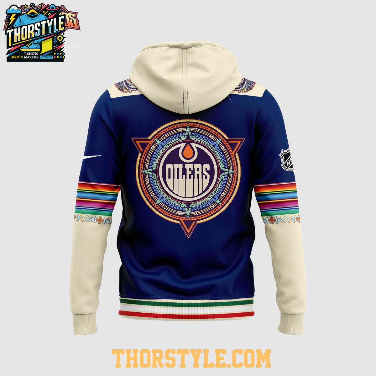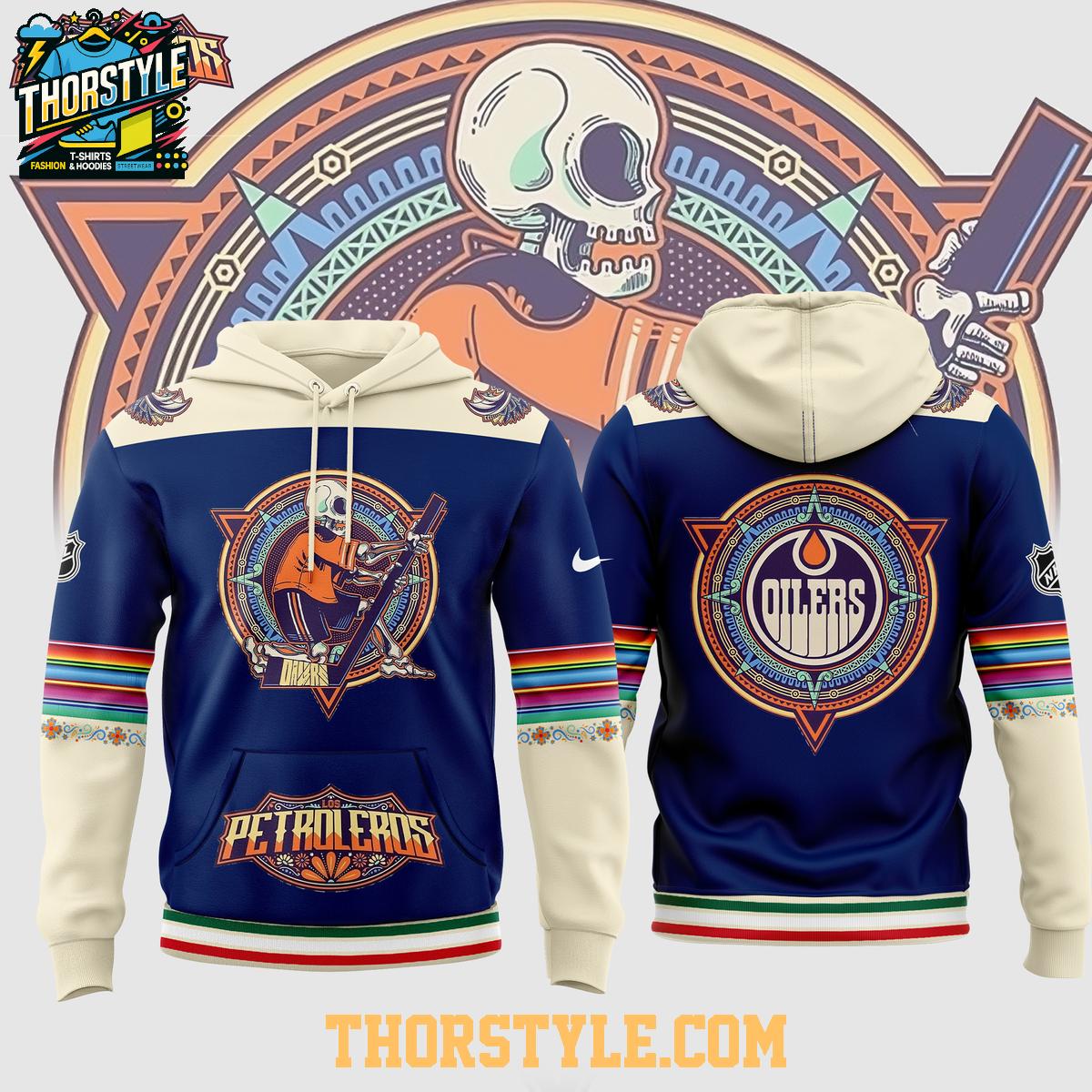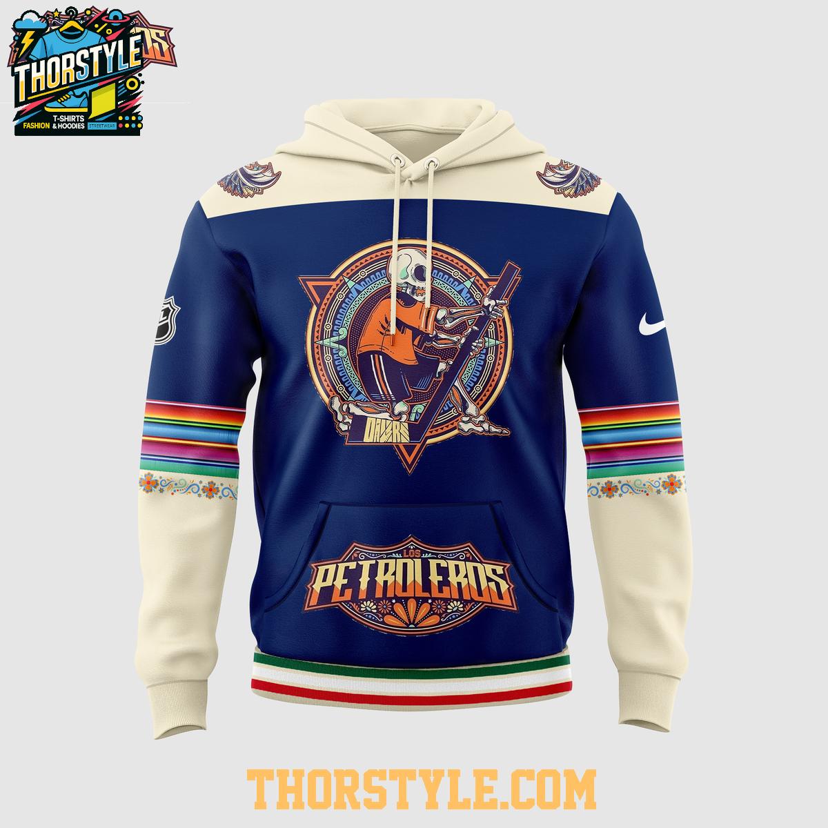 The front of the hoodie commands attention with a striking, intricately designed skeletal figure. Adorned in the iconic Oilers colors, this figure wields a hockey stick, set against a backdrop of detailed, geometric motifs that evoke traditional Mexican folk art. Subtly integrated below, the "PETROLEROS" text adds an authentic historical resonance, connecting the team's roots with the vibrant cultural theme. The deep navy blue body provides a classic foundation, expertly complemented by contrasting cream sleeves and hood, creating a visually dynamic and appealing silhouette.