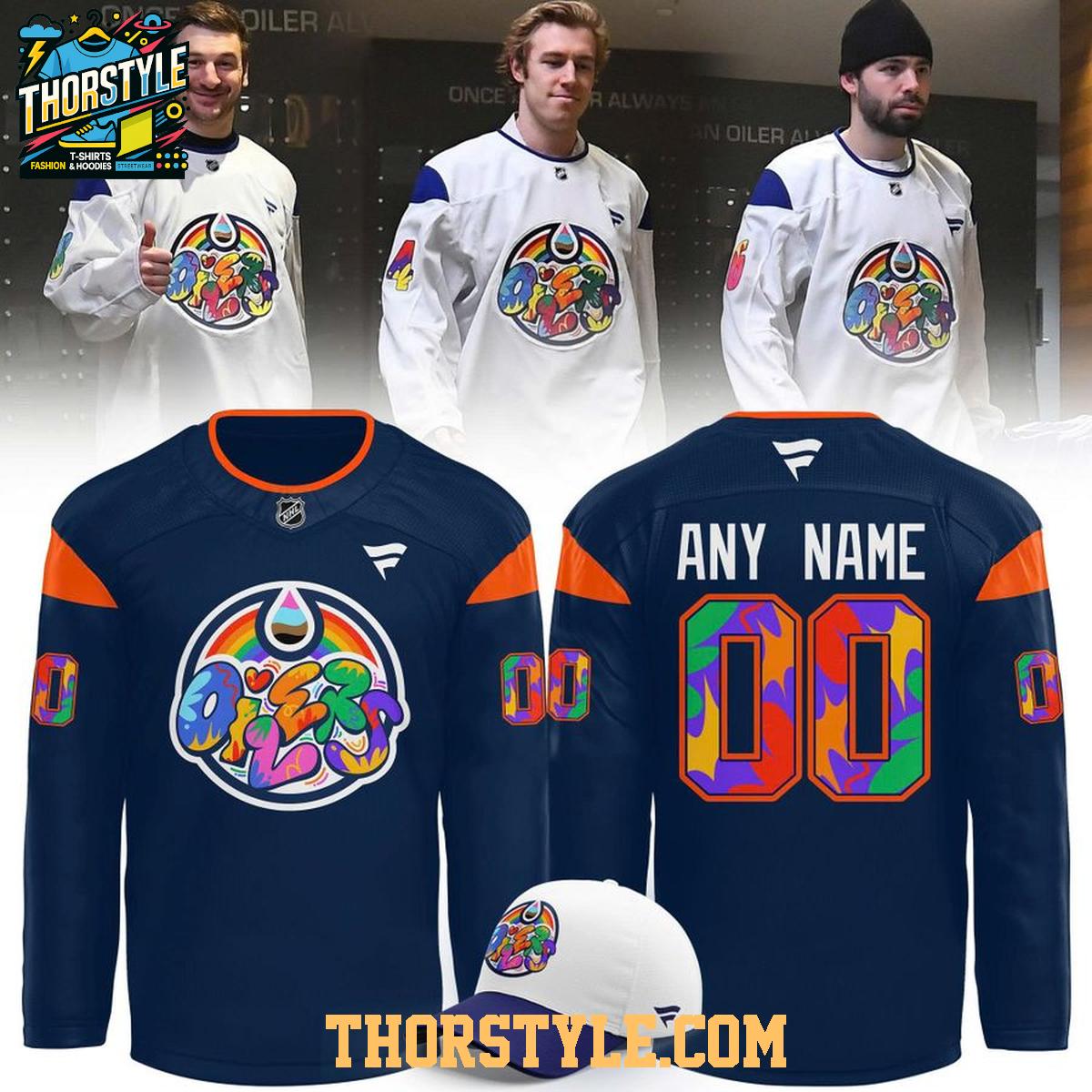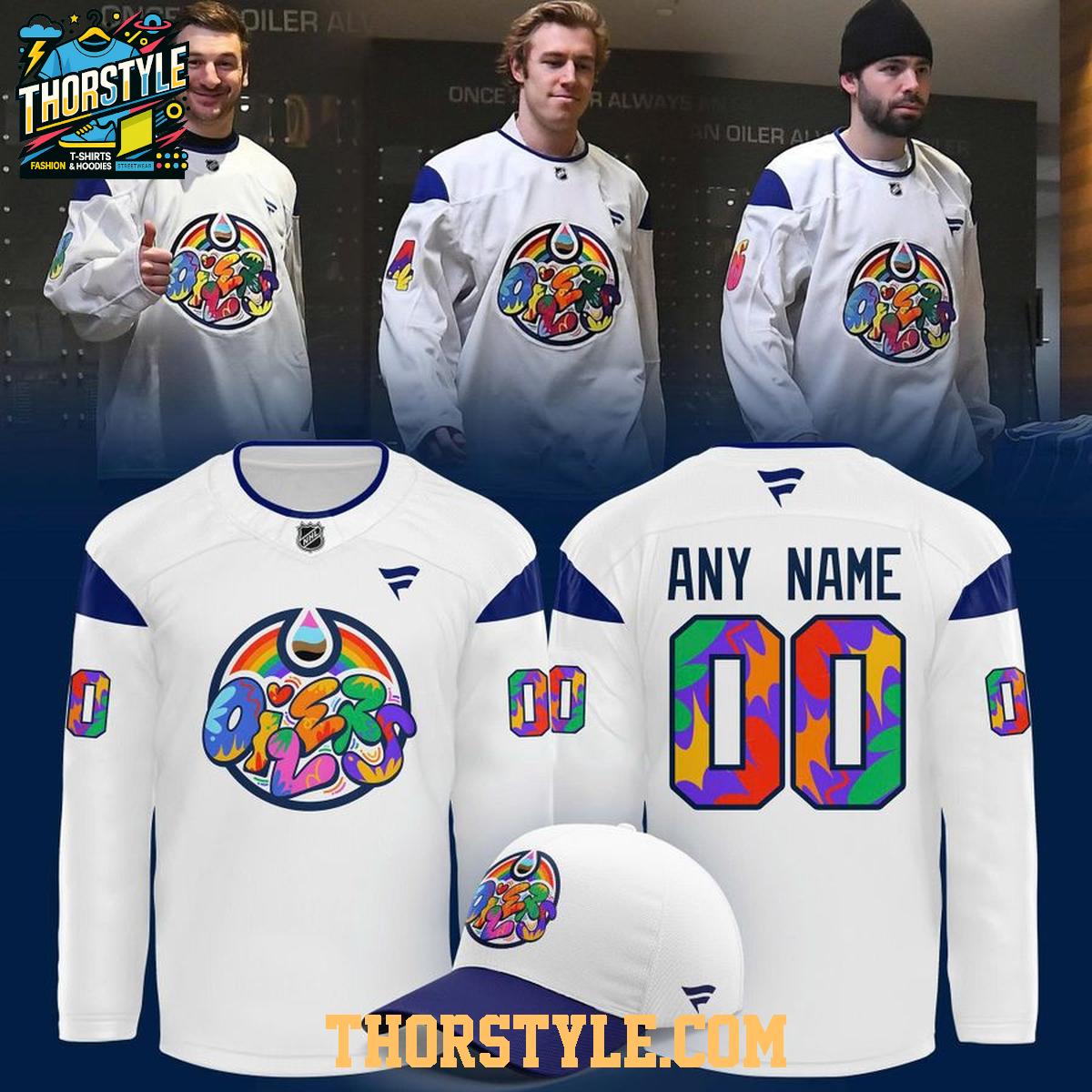 Pair this jersey with your favorite jeans or leggings for a casual yet spirited look. It's perfect for game days, community events, or simply showing your support around town. To keep your Edmonton Oilers Pride Night jersey looking its best, machine wash it inside out in cold water and tumble dry on low. This will help preserve the colors and prevent any damage to the personalized details, ensuring you can continue to wear it with pride for years to come. Get ready to make a statement and celebrate inclusivity with this special edition hockey jersey.