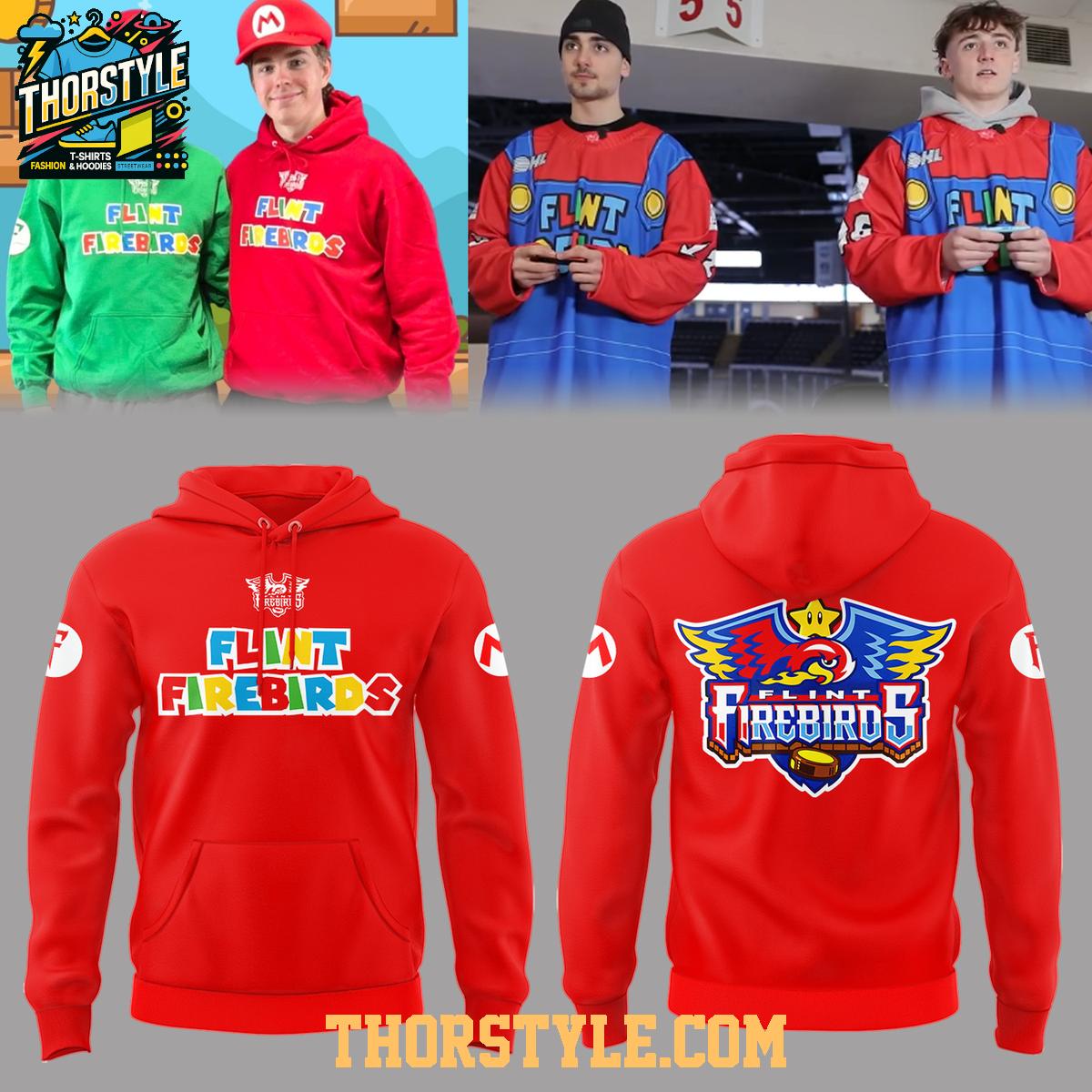 This hoodie-t-shirt hybrid features a vibrant design that captures the spirit of a special event. The front showcases the "Flint Firebirds" name emblazoned in a style reminiscent of the Super Mario logo, set against a backdrop of bold colors. The back proudly displays the Firebirds team logo, also integrated with a touch of Super Mario aesthetic, making it instantly recognizable.