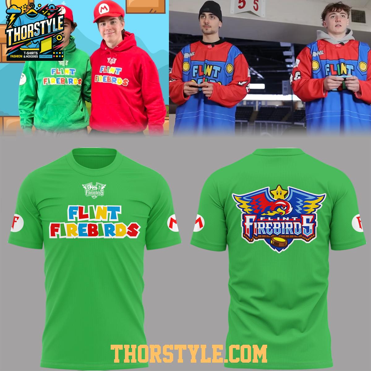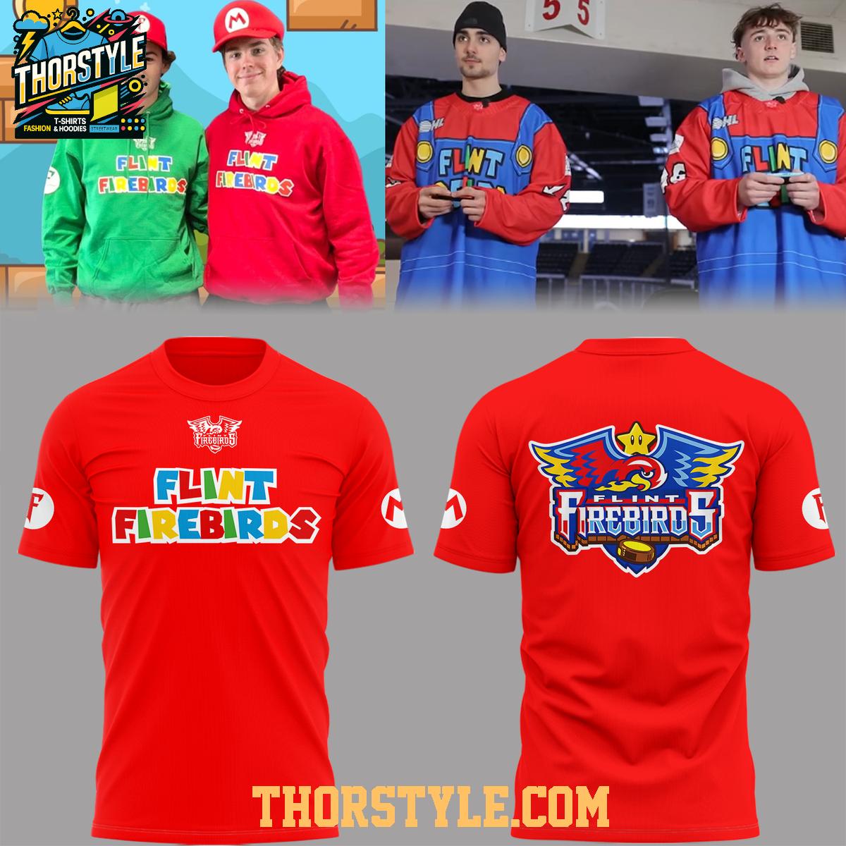 Celebrate the intersection of hockey fandom and classic gaming with the limited-edition Flint Firebirds x Super Mario 2026 Night Celebration Hoodie T-Shirt. This unique apparel piece blends the iconic imagery of the Flint Firebirds hockey team with the beloved Super Mario universe, creating a must-have item for fans of both.